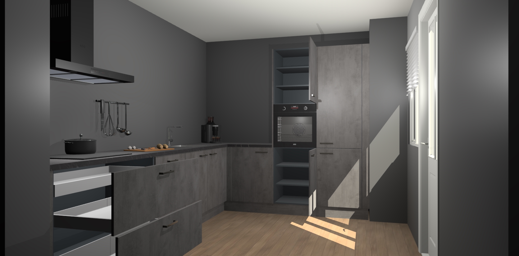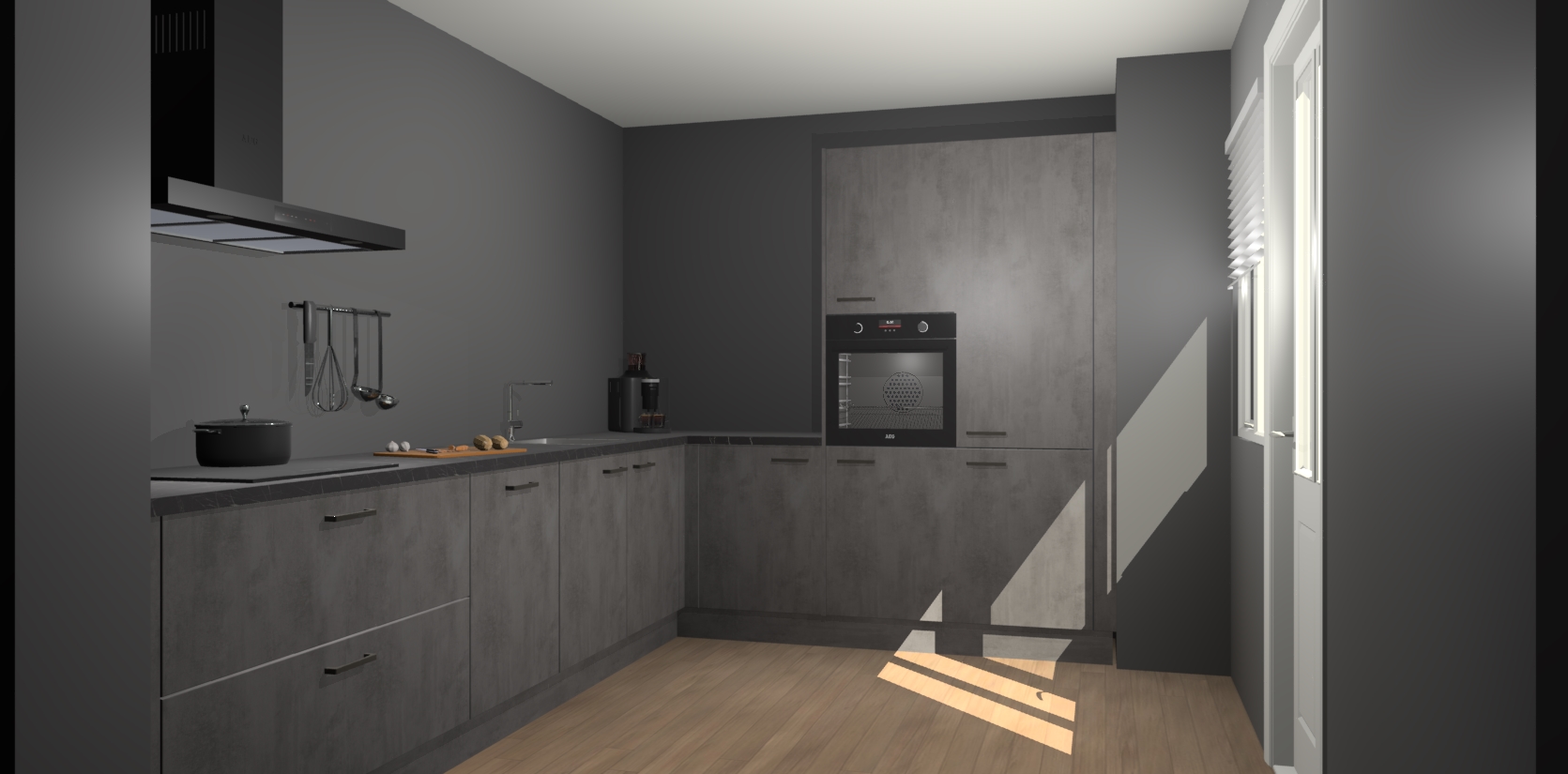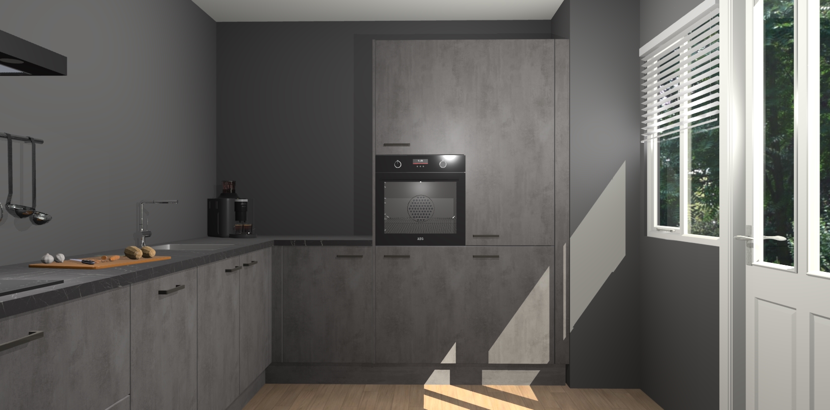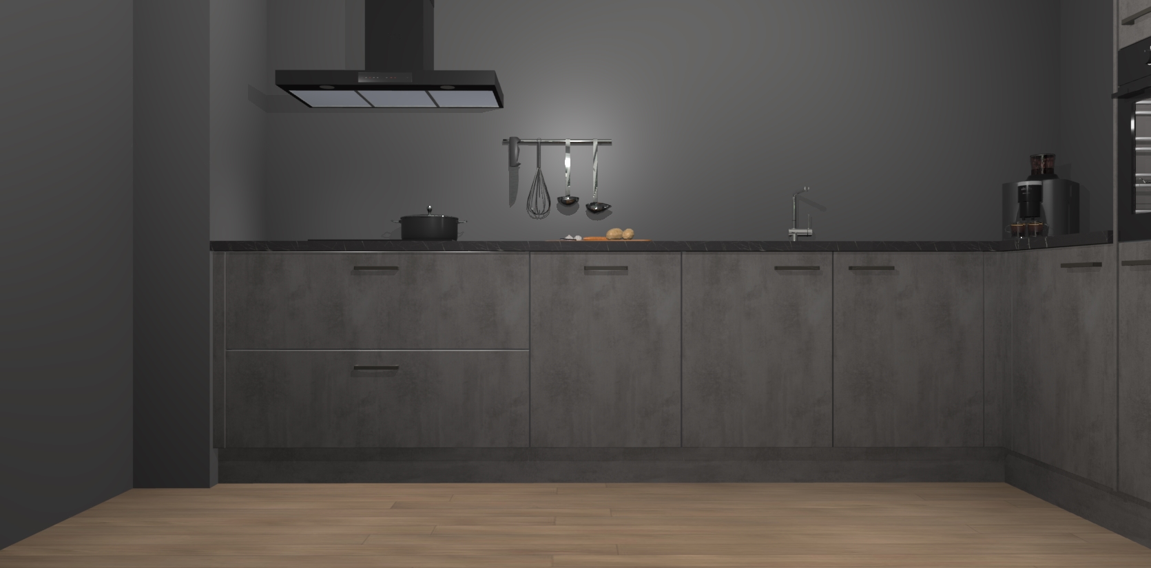 Welkom bij de Beton Antraciet keuken Portland. Deze prachtige keuken zal de komende jaren het middelpunt van de belangstelling in uw huis zijn. Uitgerust met vijf inbouwapparaten komt u nooit kookgereedschap tekort. Bovendien geeft de warme houtlook elke ruimte een uitnodigende en tijdloze uitstraling.