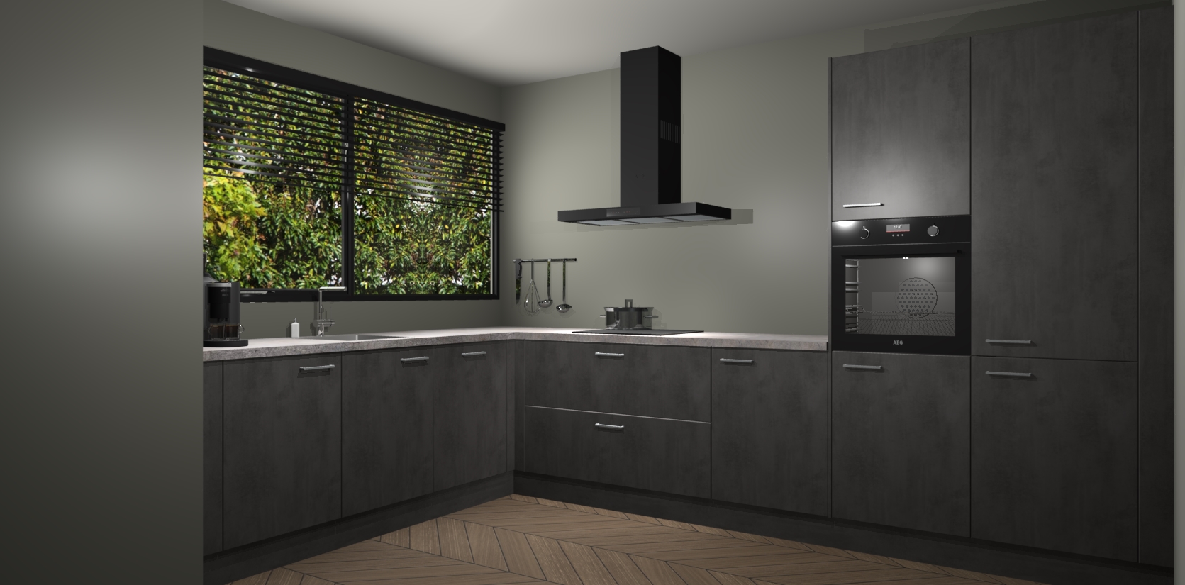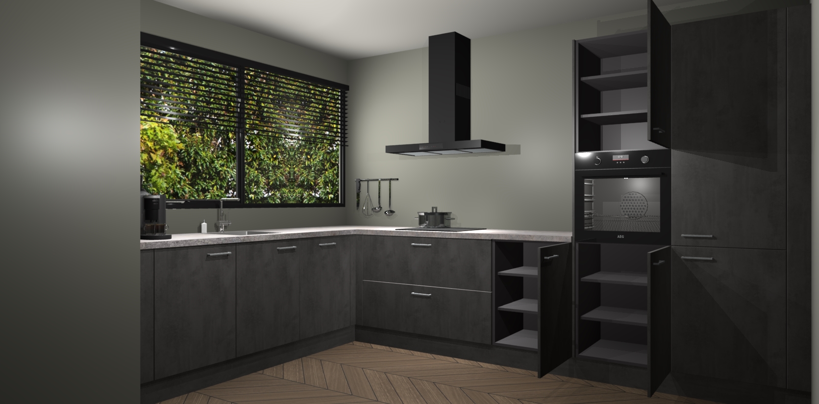 Met een modern, tijdloos design en ruime opslagruimte, zult u zich in no-time thuis voelen in uw nieuwe keuken. Uw leven wordt eenvoudiger met de soft-close deuren die voor het ultieme stille comfort zorgen - geen geluid dat u stoort terwijl u kookt. Ook is de keuken voorzien van 5 ingebouwde apparaten: een oven, inductie kookplaat, afzuigkap, vaatwasser en koelkast. Deze kunnen gemakkelijk na bestelling worden bijgewerkt naar AEG - waardoor uw luxe ervaring compleet is.