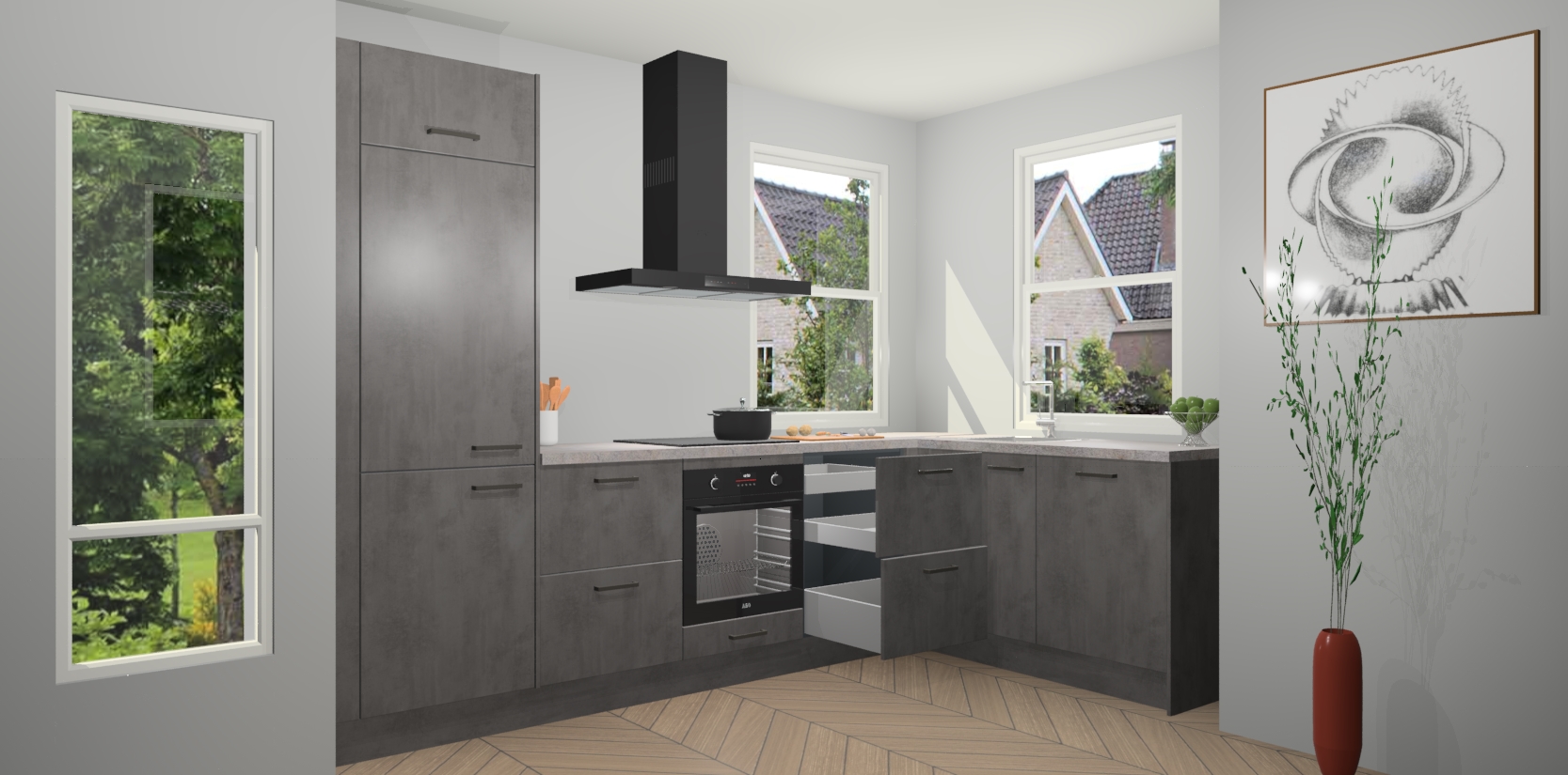 Welkom bij de Beton Antraciet keuken Salzburg! Met een chique combinatie van een prachtig houten werkblad, klassiek design en altijd concurrerende prijzen is de Beton Antraciet keuken Salzburg de keuken van uw dromen! Deze keuken is perfect voor alle huisformaten en decorstijlen en straalt stijl en verfijning uit. Van het tijdloze design tot de functionele functies, er is geen betere manier om de look van uw woon- of kookruimte te verbeteren.