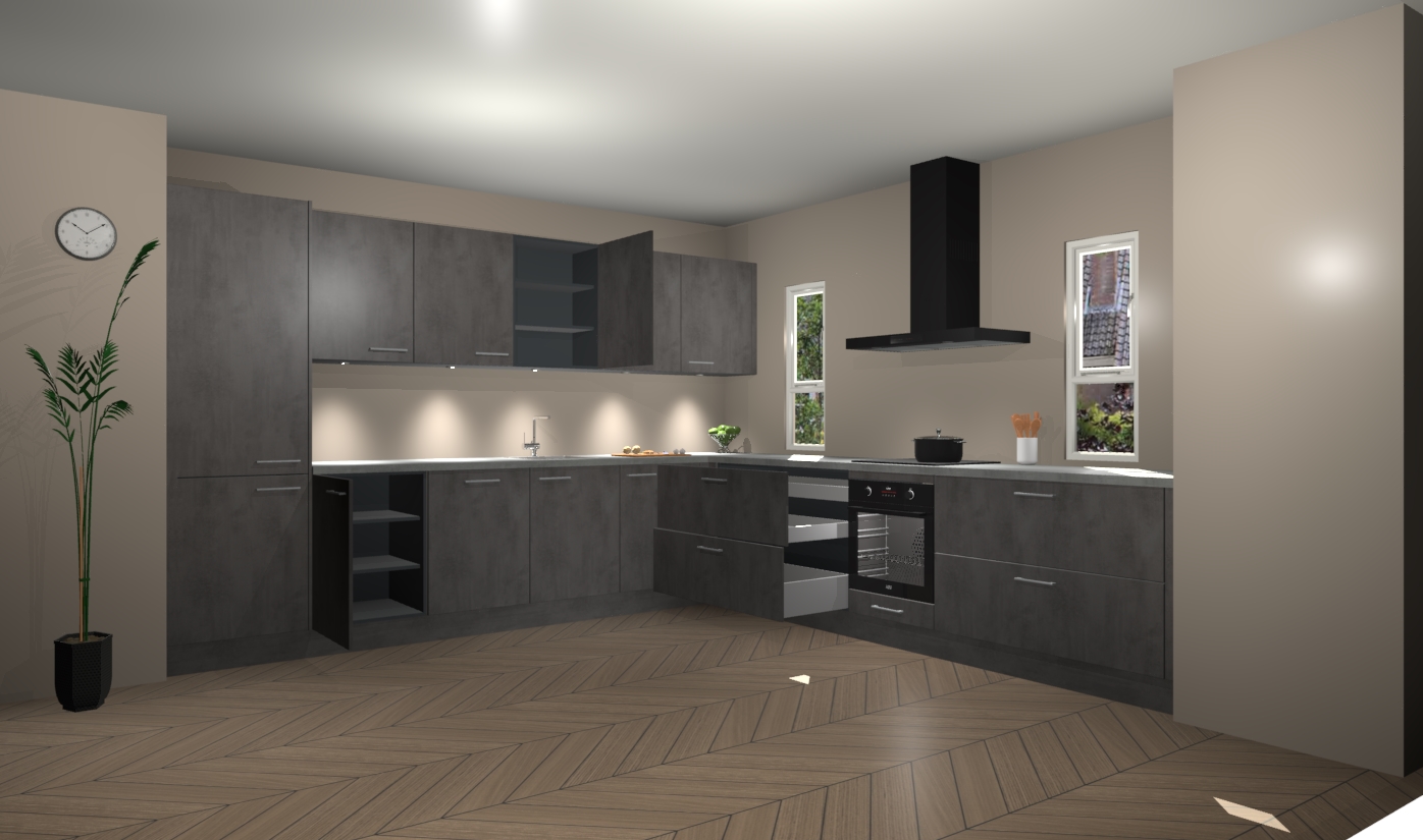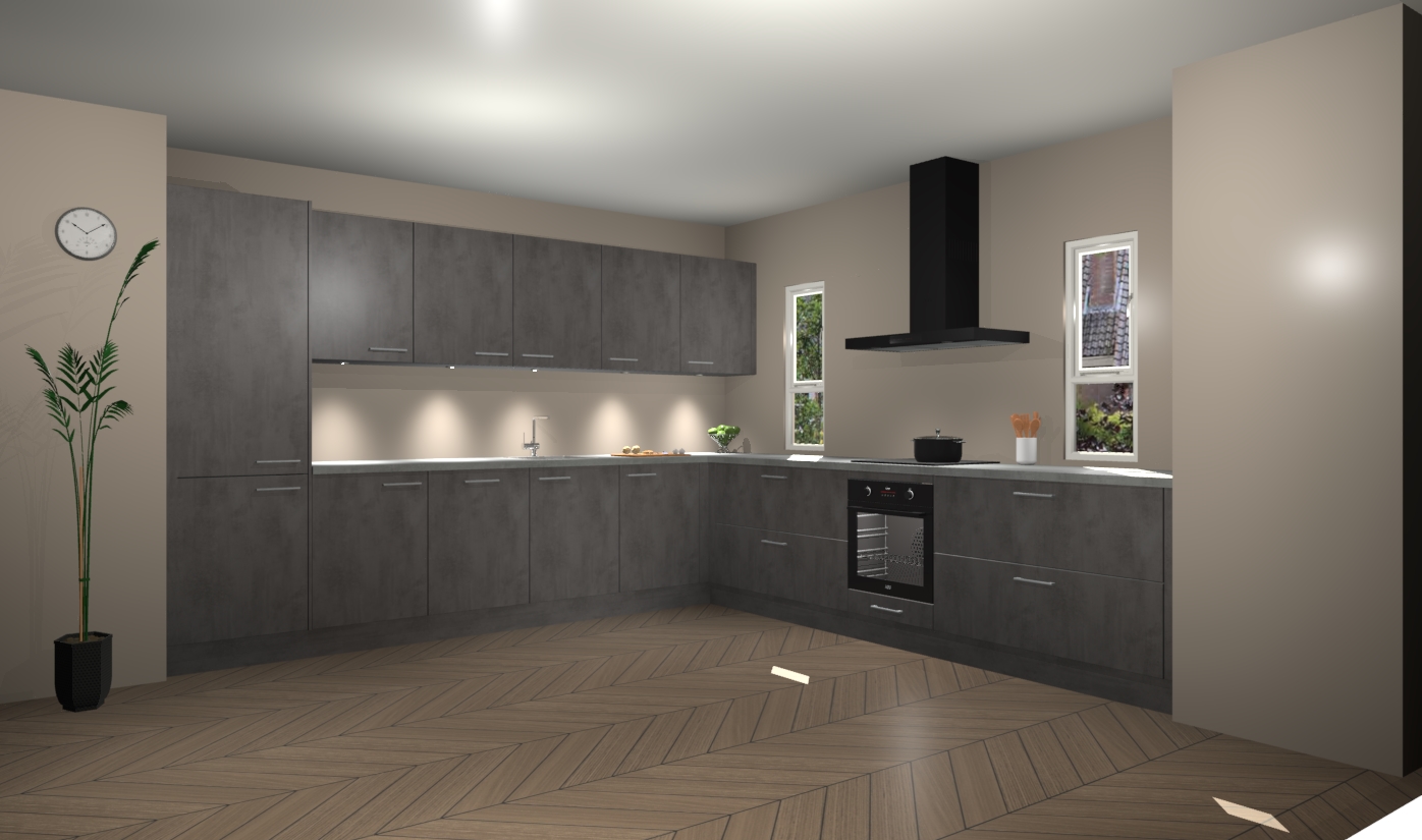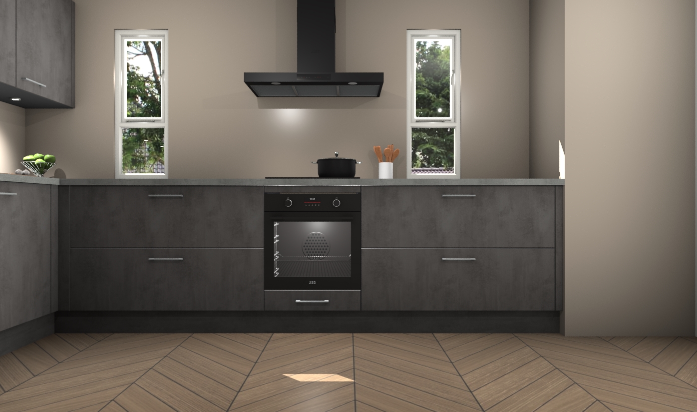De beton antraciet keuken is een ideale hoekkeuken en heeft alle functies en apparatuur die u maar nodig kunt hebben. Bij de bestelling krijgt u een oven, inductiekookplaat, afzuigkap, vaatwasser en koelkast - deze kunnen desgewenst eenvoudig worden uitgebreid naar AEG na bestellen. Elke kast wordt ook voor gemonteerd geleverd met soft close deuren die jarenlang gebruik beloven. Stelt u zich voor dat u geen gedoe heeft met vervelende montage - vanaf het moment dat u uw bestelling plaats, duurt het slechts 7 weken voor het bij u thuis geleverd wordt.