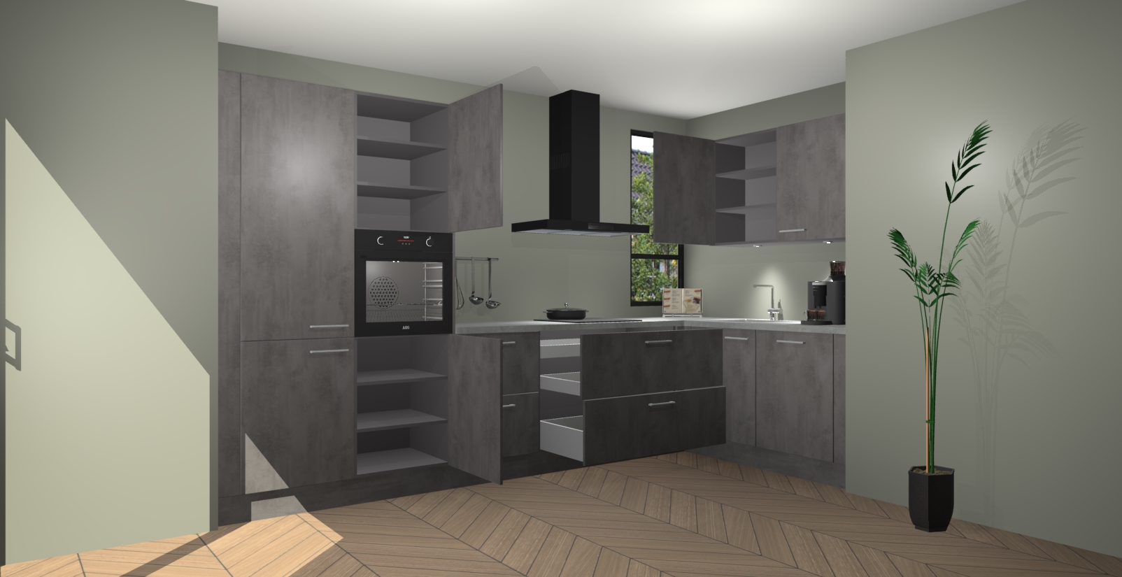 Welkom in uw nieuwe moderne keuken! Laat ons u voorstellen aan de Beton Antraciet keuken Vlaanderen . Deze prachtige hoekkeuken straalt exclusiviteit en luxe uit als geen ander. Het strakke design, de tijdloze kleuren en het model maken van deze keuken een moderne klassieker. En met voldoende opbergruimte heeft deze keuken echt voor ieder wat wils.