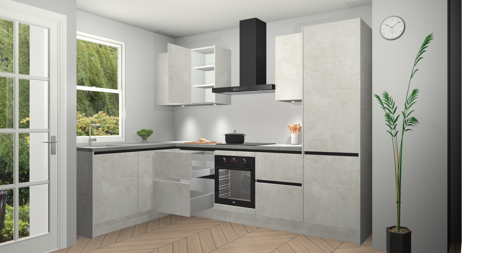 Bent u op zoek naar een strakke, moderne hoekkeuken die uw huis oppept en een moderne uitstraling geeft? Kijk dan niet verder dan de beton opaal greeploze keuken Beijing. Deze verbluffende hoekkeuken tilt hedendaags design naar een hoger niveau. Qua stijl is deze chique hoekkeuken voorzien van beton opaal accenten, om een strakke maar opvallende look te creëren. De binnenkant van de kasten is afgewerkt in dezelfde prachtige beton opaal kleur voor extra esthetische aantrekkingskracht.