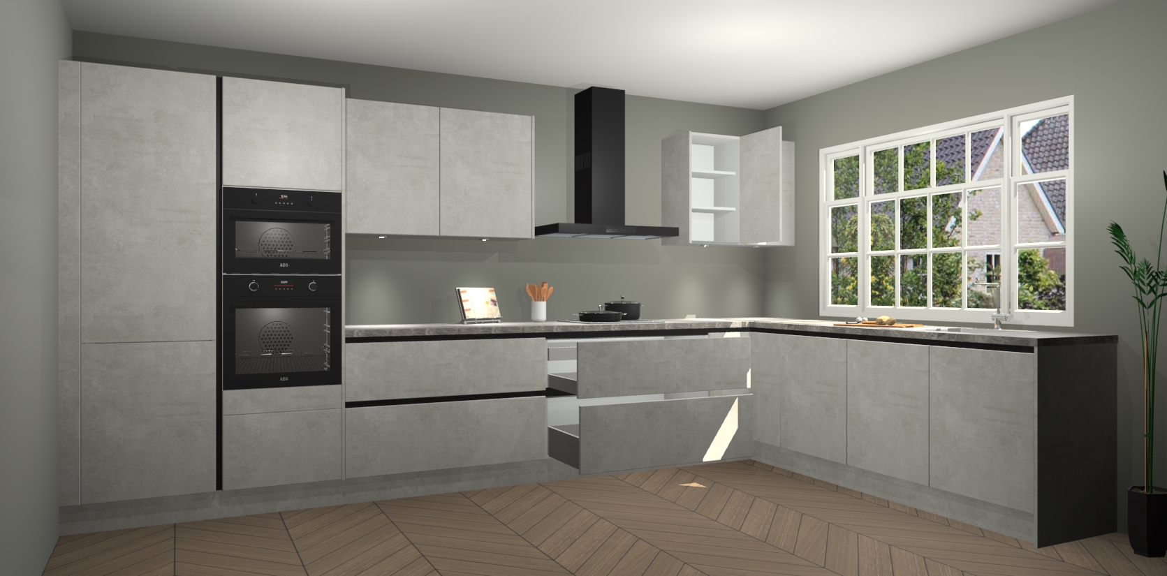 Kom dichtbij de perfecte keuken van uw dromen met de beton opaal greeploze keuken Graz. Met een prachtige houtlook en eigentijds ontwerp, straalt deze keuken warmte en sfeer uit. Of u nu liefhebber bent van traditionele of moderne stijlen, er is genoeg ruimte om aan al uw behoeften te voldoen.