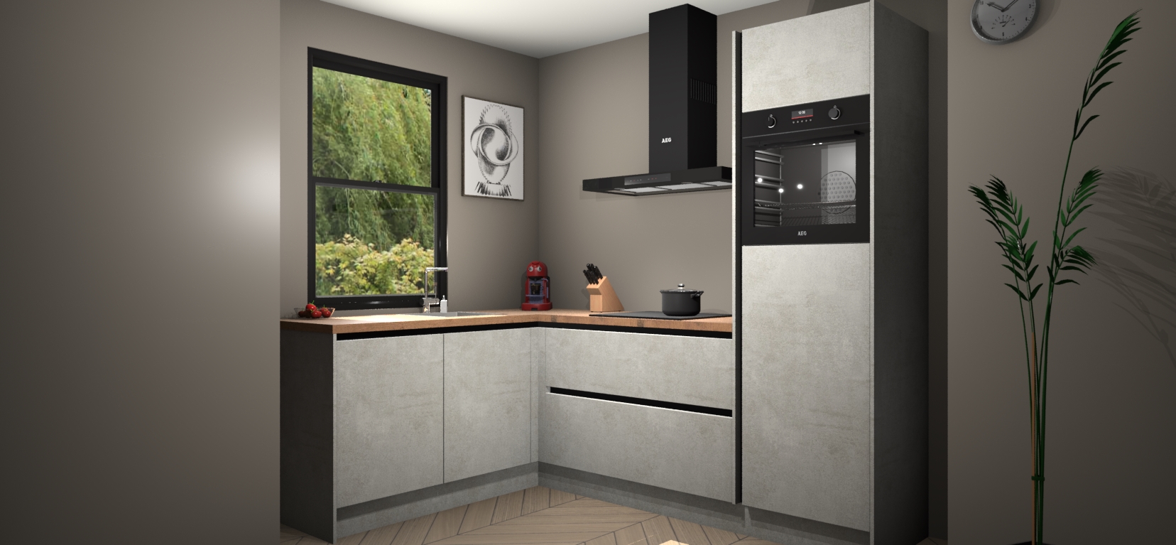 Deze prachtige hoekkeuken heeft alle benodigdheden om uw droomkook- en eetruimte compleet te maken. De Beton Opaal kasten bieden een echo van raffinement, terwijl de 5 inbouwapparaten genoeg opties bieden voor het bereiden van heerlijke maaltijden. De oven, inductiekookplaat, afzuigkap, vaatwasser en koelkast zorgen ervoor dat u tijd in de keuken zo efficiënt mogelijk verloopt, terwijl ze ook dat extra vleugje luxe bieden.