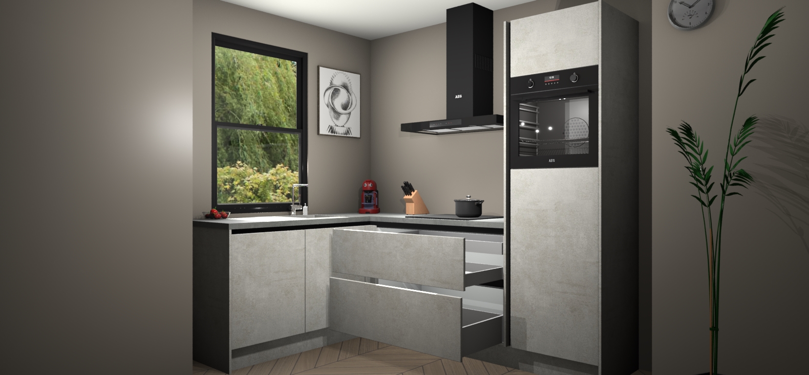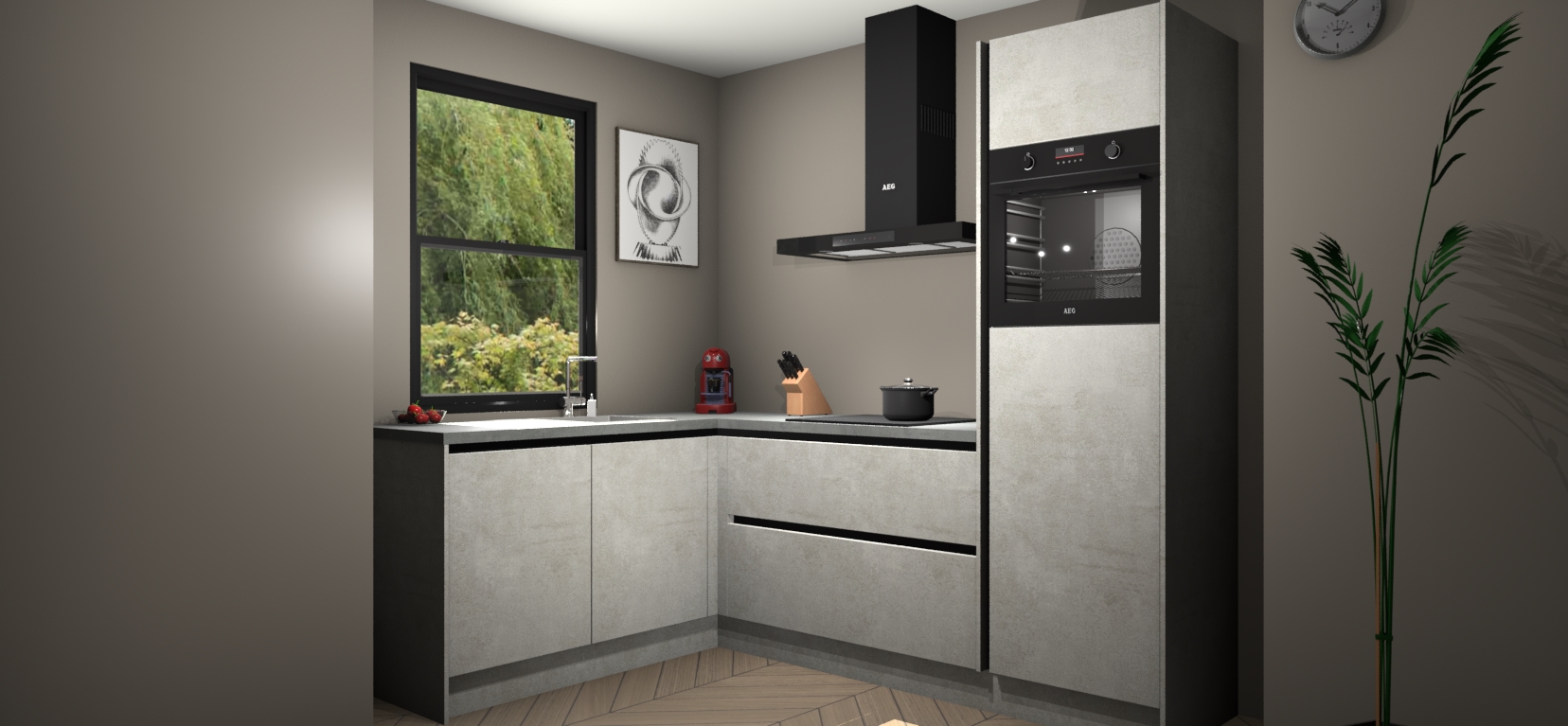 Deze prachtige hoekkeuken heeft alle benodigdheden om uw droomkook- en eetruimte compleet te maken. De Beton Opaal kasten bieden een echo van raffinement, terwijl de 5 inbouwapparaten genoeg opties bieden voor het bereiden van heerlijke maaltijden. De oven, inductiekookplaat, afzuigkap, vaatwasser en koelkast zorgen ervoor dat u tijd in de keuken zo efficiënt mogelijk verloopt, terwijl ze ook dat extra vleugje luxe bieden.