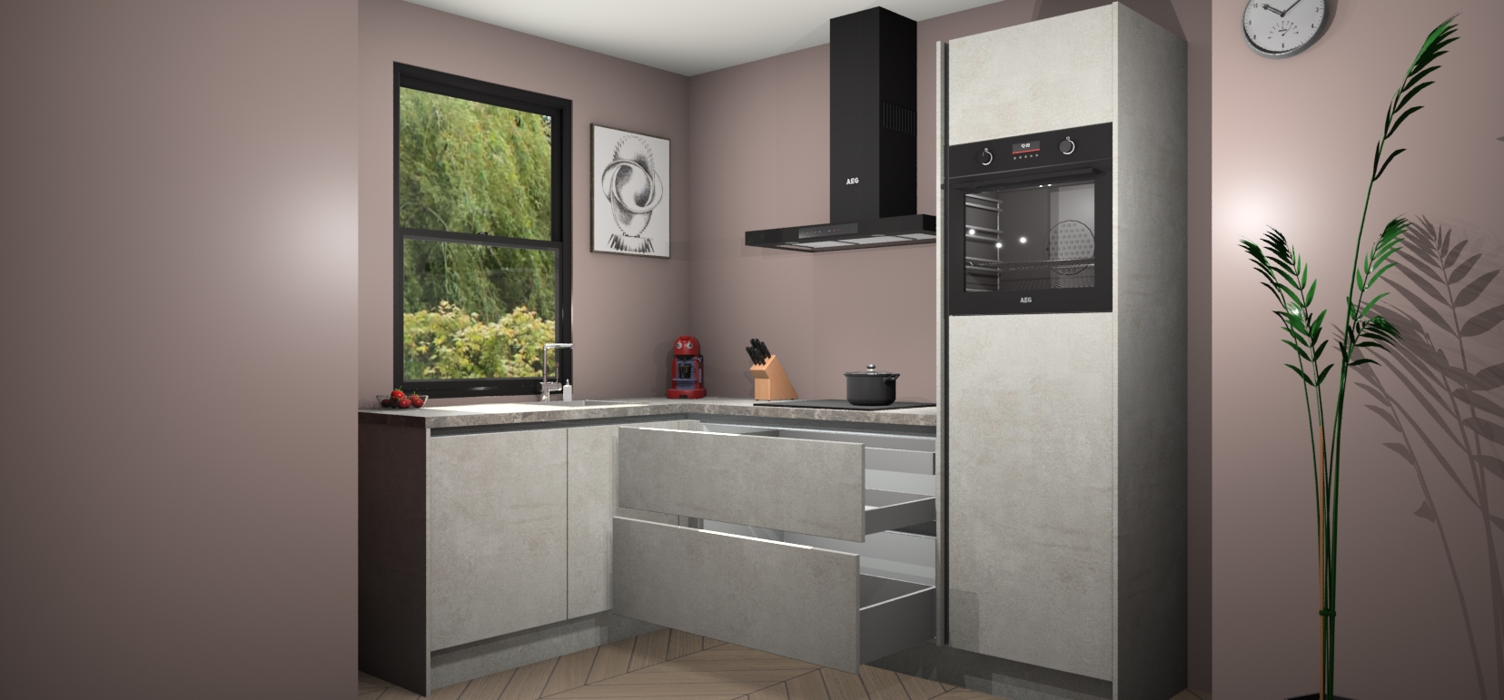 Deze prachtige hoekkeuken heeft alle benodigdheden om uw droomkook- en eetruimte compleet te maken. De Beton Opaal kasten bieden een echo van raffinement, terwijl de 5 inbouwapparaten genoeg opties bieden voor het bereiden van heerlijke maaltijden. De oven, inductiekookplaat, afzuigkap, vaatwasser en koelkast zorgen ervoor dat u tijd in de keuken zo efficiënt mogelijk verloopt, terwijl ze ook dat extra vleugje luxe bieden.