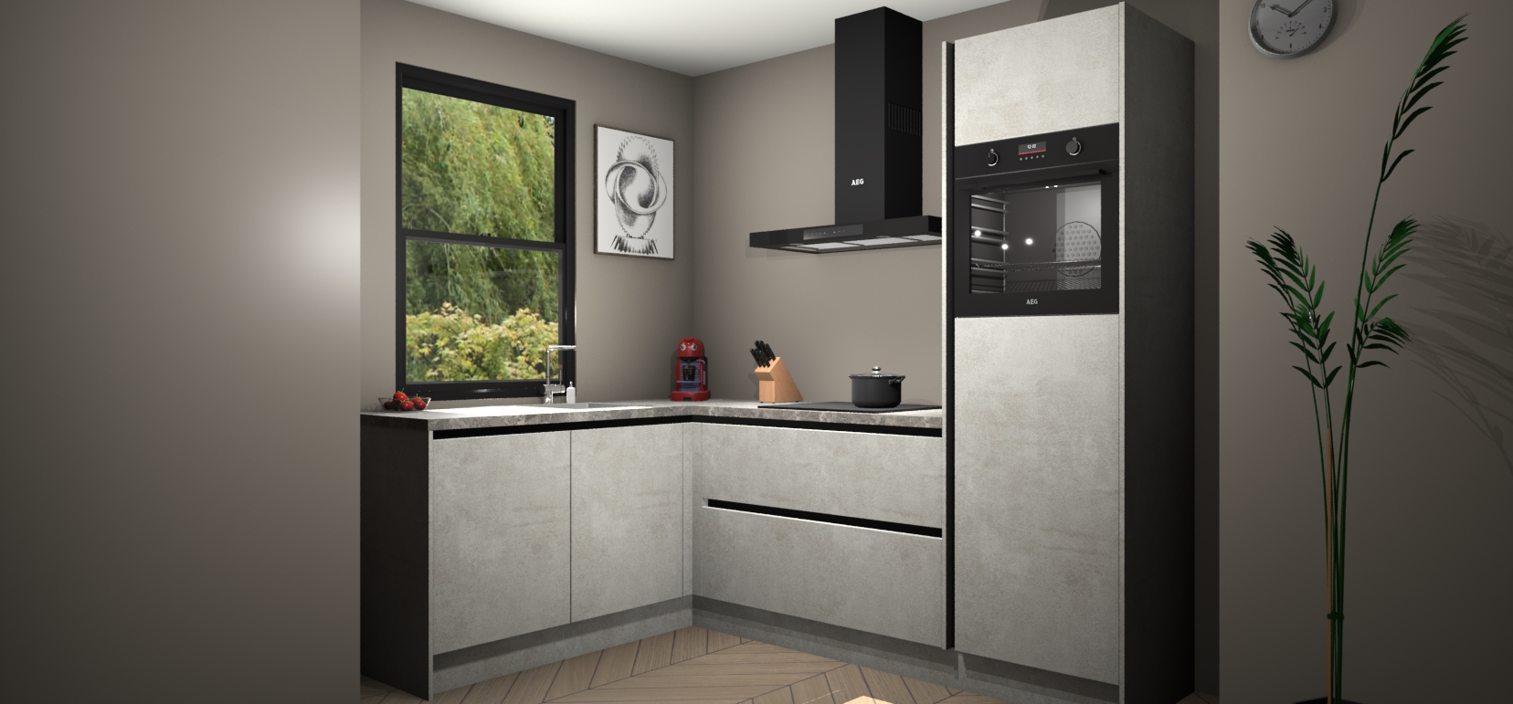 Deze prachtige hoekkeuken heeft alle benodigdheden om uw droomkook- en eetruimte compleet te maken. De Beton Opaal kasten bieden een echo van raffinement, terwijl de 5 inbouwapparaten genoeg opties bieden voor het bereiden van heerlijke maaltijden. De oven, inductiekookplaat, afzuigkap, vaatwasser en koelkast zorgen ervoor dat u tijd in de keuken zo efficiënt mogelijk verloopt, terwijl ze ook dat extra vleugje luxe bieden.