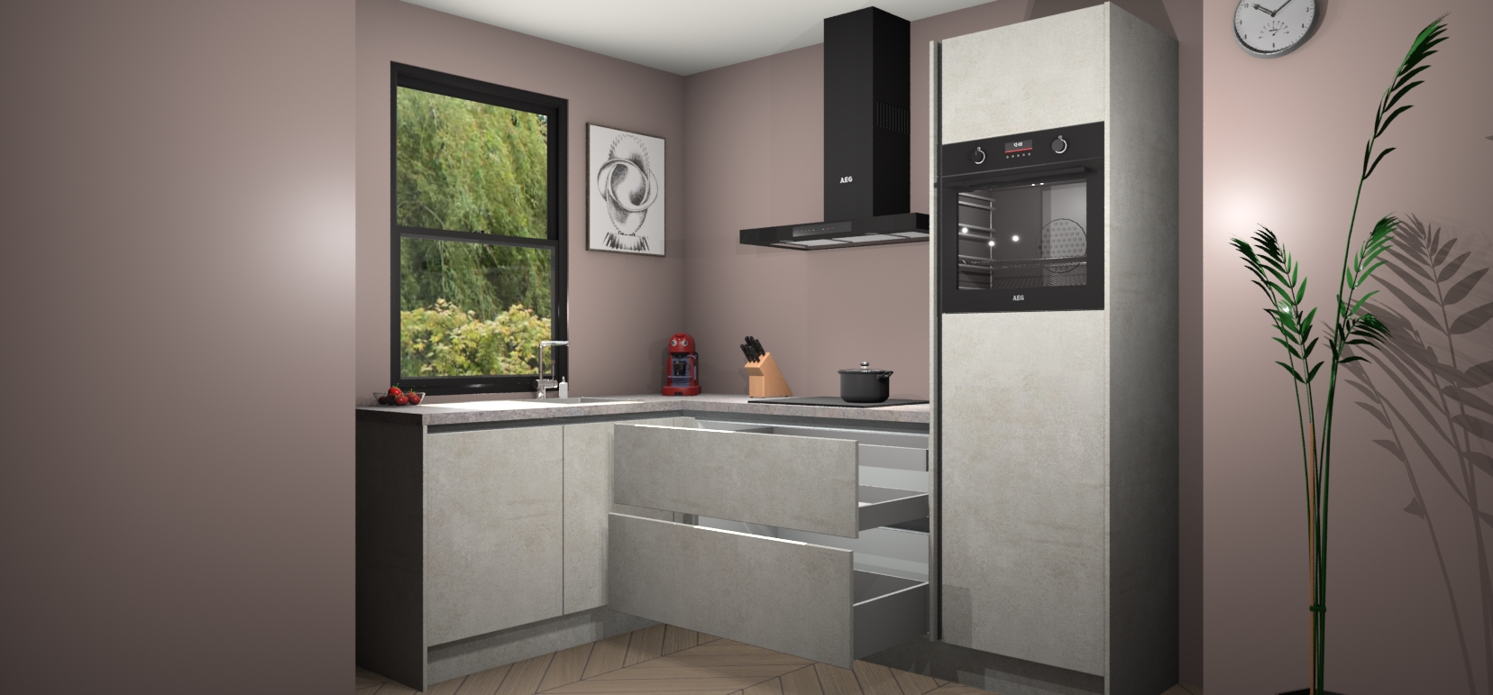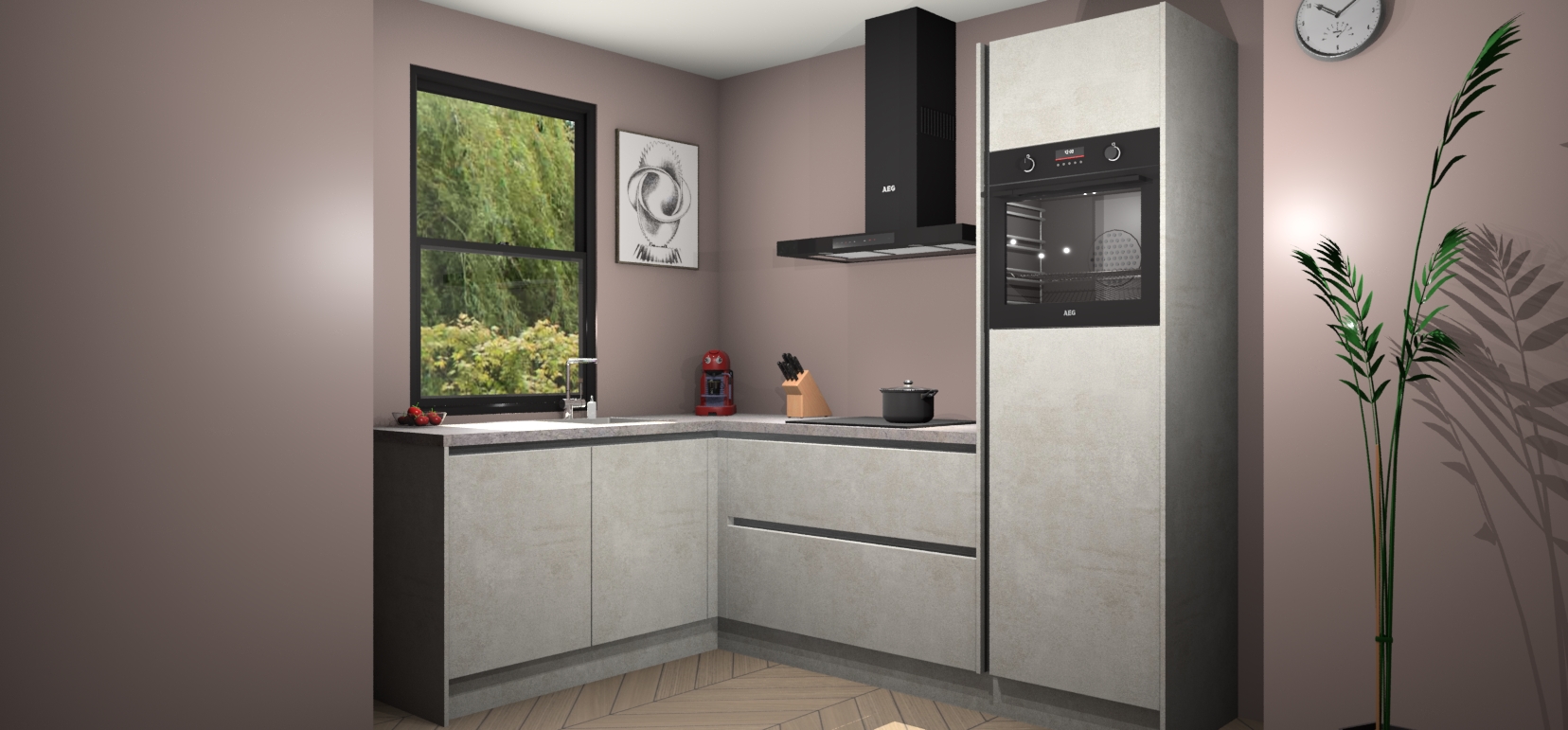 Deze prachtige hoekkeuken heeft alle benodigdheden om uw droomkook- en eetruimte compleet te maken. De Beton Opaal kasten bieden een echo van raffinement, terwijl de 5 inbouwapparaten genoeg opties bieden voor het bereiden van heerlijke maaltijden. De oven, inductiekookplaat, afzuigkap, vaatwasser en koelkast zorgen ervoor dat u tijd in de keuken zo efficiënt mogelijk verloopt, terwijl ze ook dat extra vleugje luxe bieden.