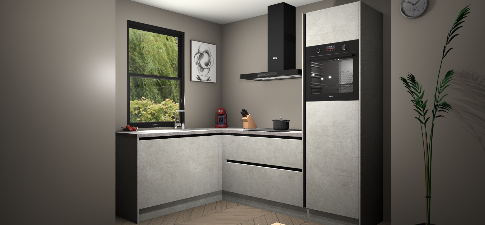 Deze prachtige hoekkeuken heeft alle benodigdheden om uw droomkook- en eetruimte compleet te maken. De Beton Opaal kasten bieden een echo van raffinement, terwijl de 5 inbouwapparaten genoeg opties bieden voor het bereiden van heerlijke maaltijden. De oven, inductiekookplaat, afzuigkap, vaatwasser en koelkast zorgen ervoor dat u tijd in de keuken zo efficiënt mogelijk verloopt, terwijl ze ook dat extra vleugje luxe bieden.
