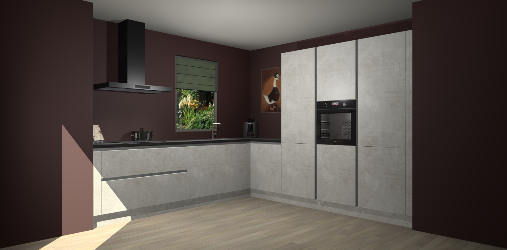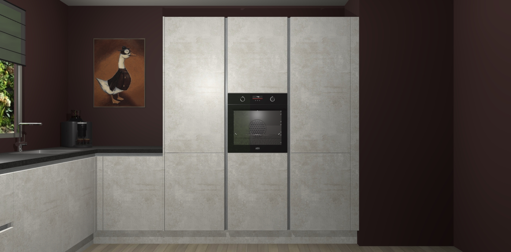Welkom bij de Beton Opaal greeploze keuken Laos. Deze prachtige keuken zal de komende jaren het middelpunt van de belangstelling in uw huis zijn. Uitgerust met vijf inbouwapparaten komt u nooit kookgereedschap tekort. Bovendien geeft de warme houtlook elke ruimte een uitnodigende en tijdloze uitstraling.