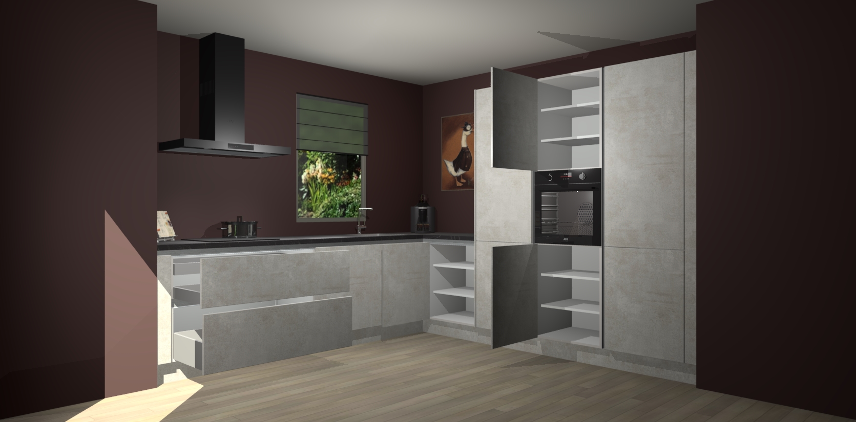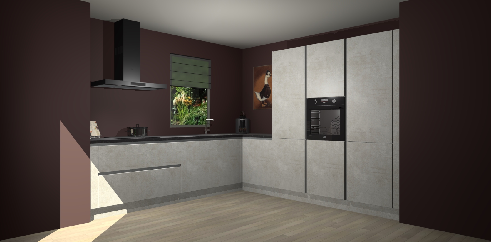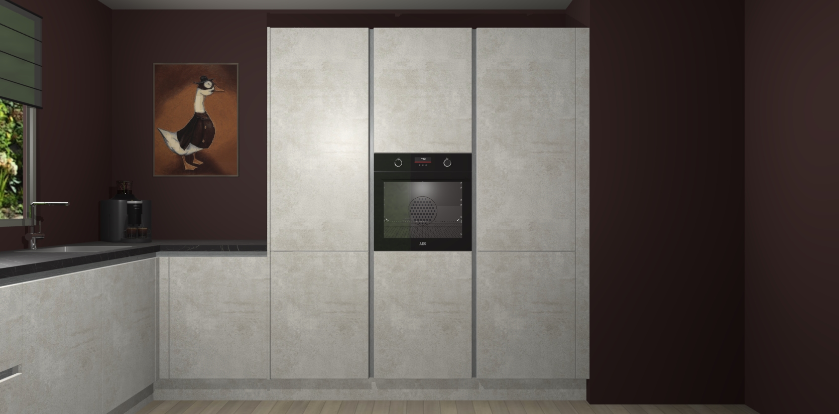 Welkom bij de Beton Opaal greeploze keuken Laos. Deze prachtige keuken zal de komende jaren het middelpunt van de belangstelling in uw huis zijn. Uitgerust met vijf inbouwapparaten komt u nooit kookgereedschap tekort. Bovendien geeft de warme houtlook elke ruimte een uitnodigende en tijdloze uitstraling.