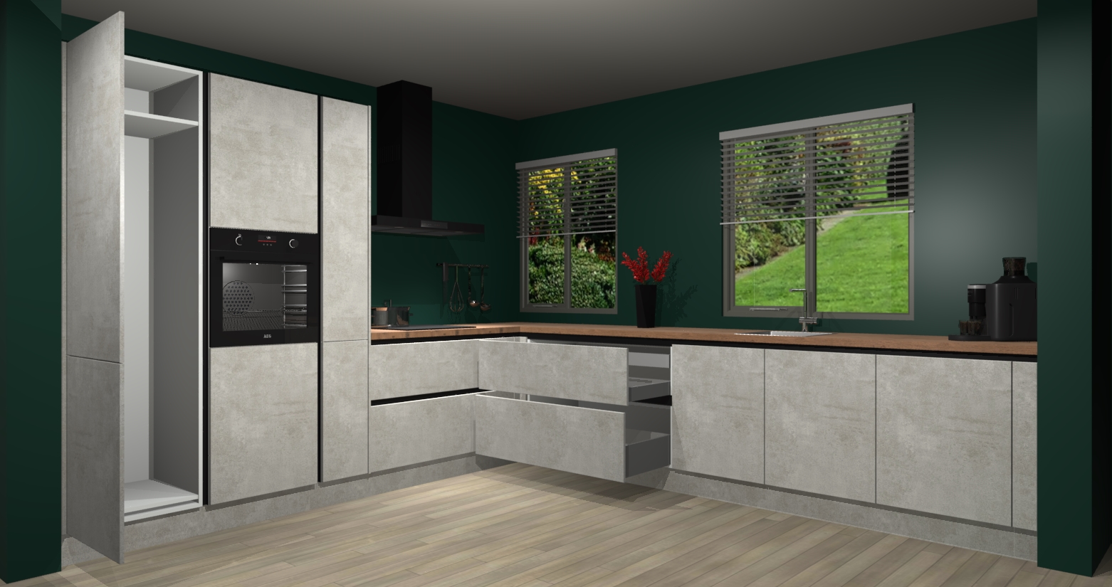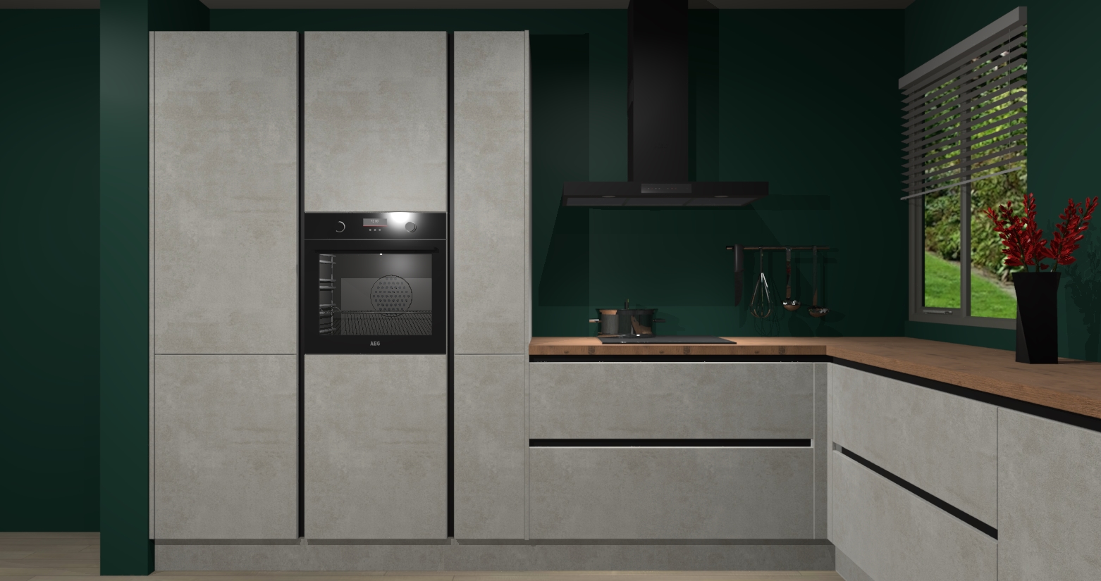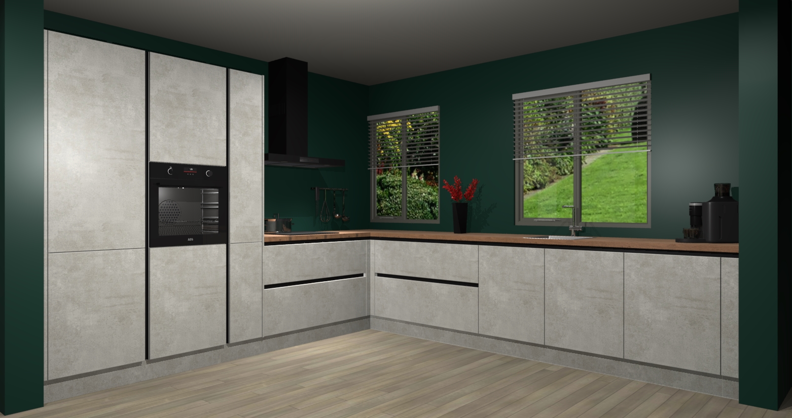 Welkom bij de Beton Opaal keuken Palermo. Deze prachtige keuken zal de komende jaren het middelpunt van de belangstelling in uw huis zijn. Uitgerust met vijf inbouwapparaten komt u nooit kookgereedschap tekort. Bovendien geeft de warme houtlook elke ruimte een uitnodigende en tijdloze uitstraling.