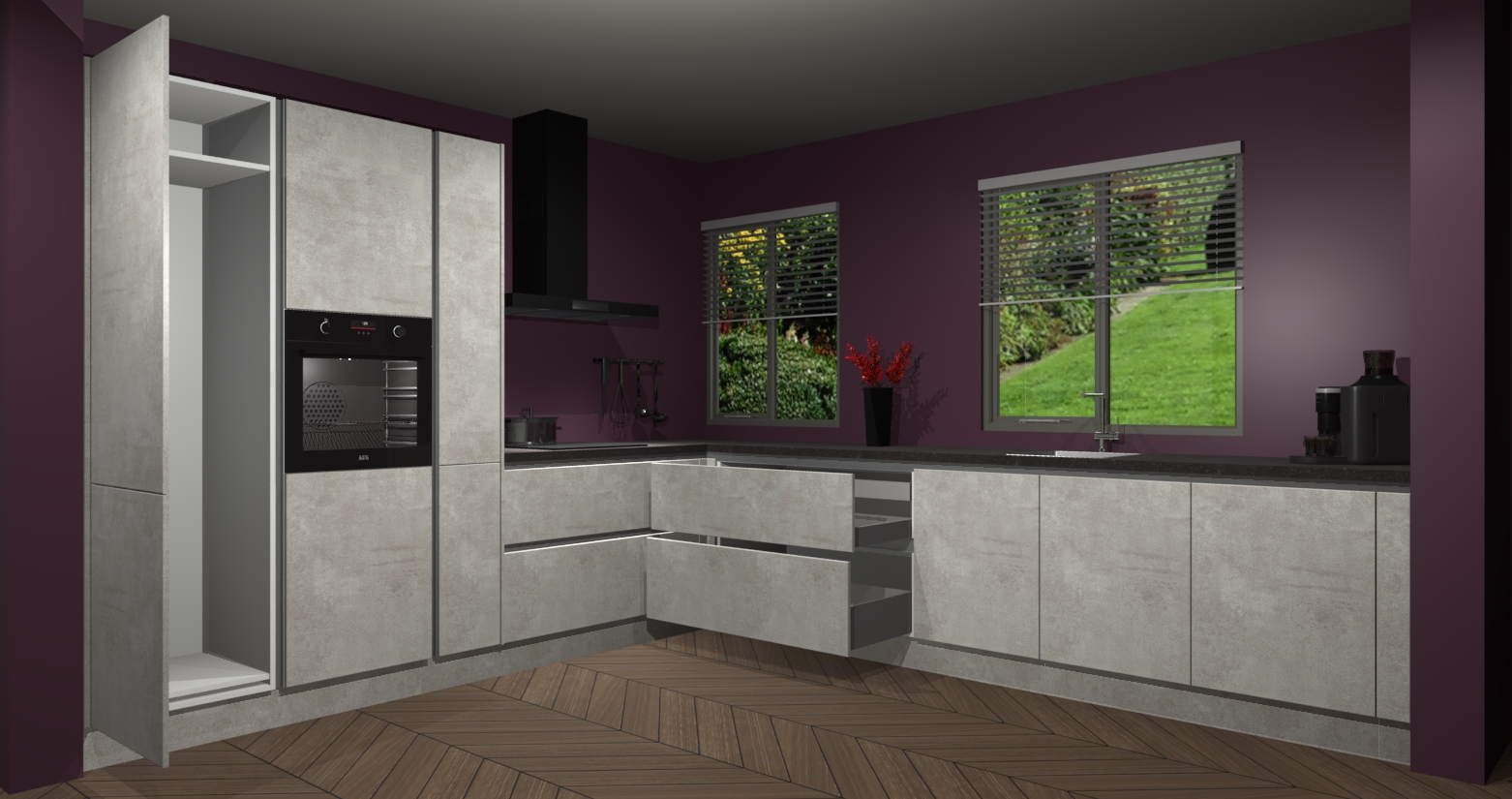 Welkom bij de Beton Opaal keuken Palermo. Deze prachtige keuken zal de komende jaren het middelpunt van de belangstelling in uw huis zijn. Uitgerust met vijf inbouwapparaten komt u nooit kookgereedschap tekort. Bovendien geeft de warme houtlook elke ruimte een uitnodigende en tijdloze uitstraling.