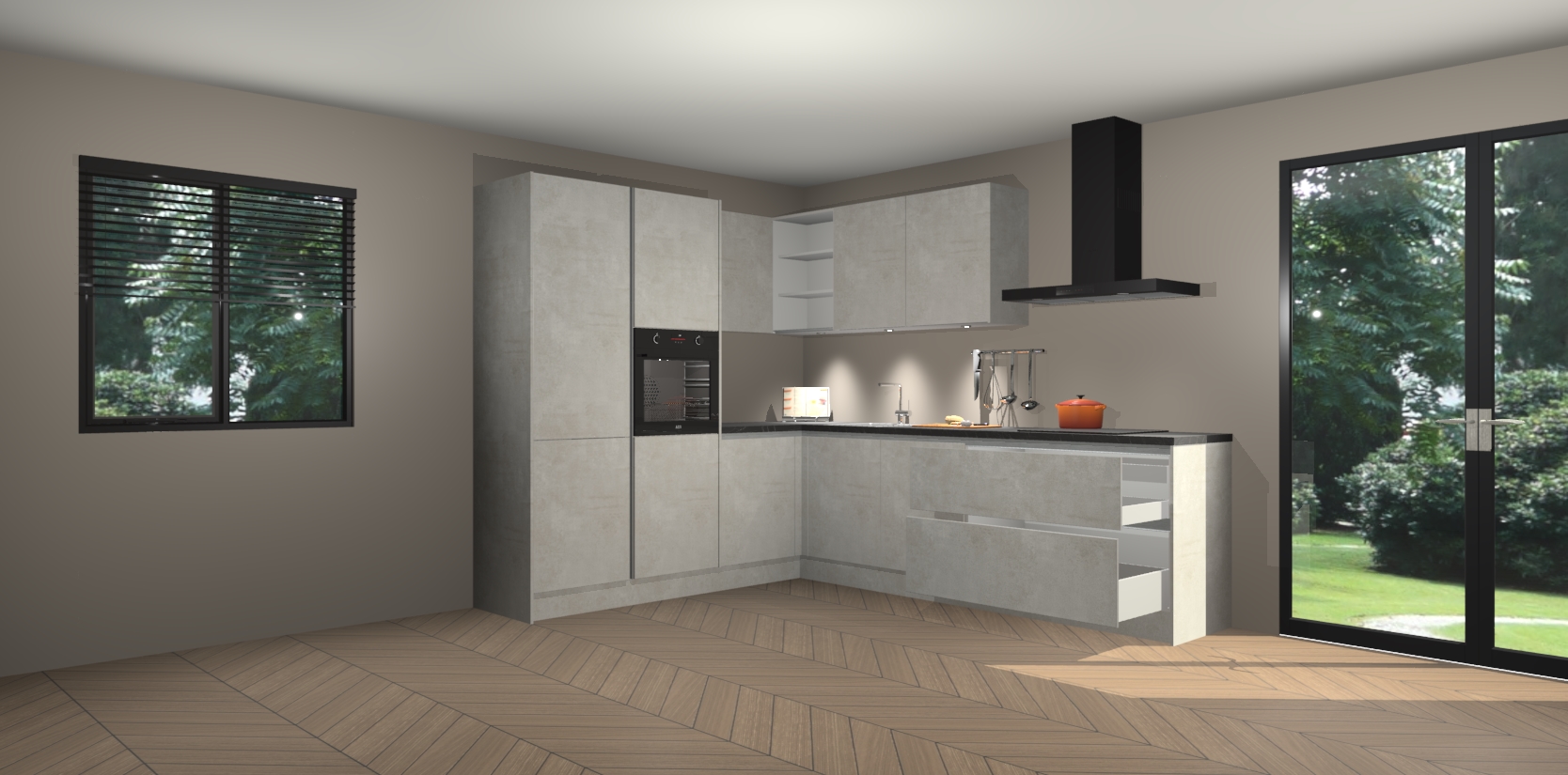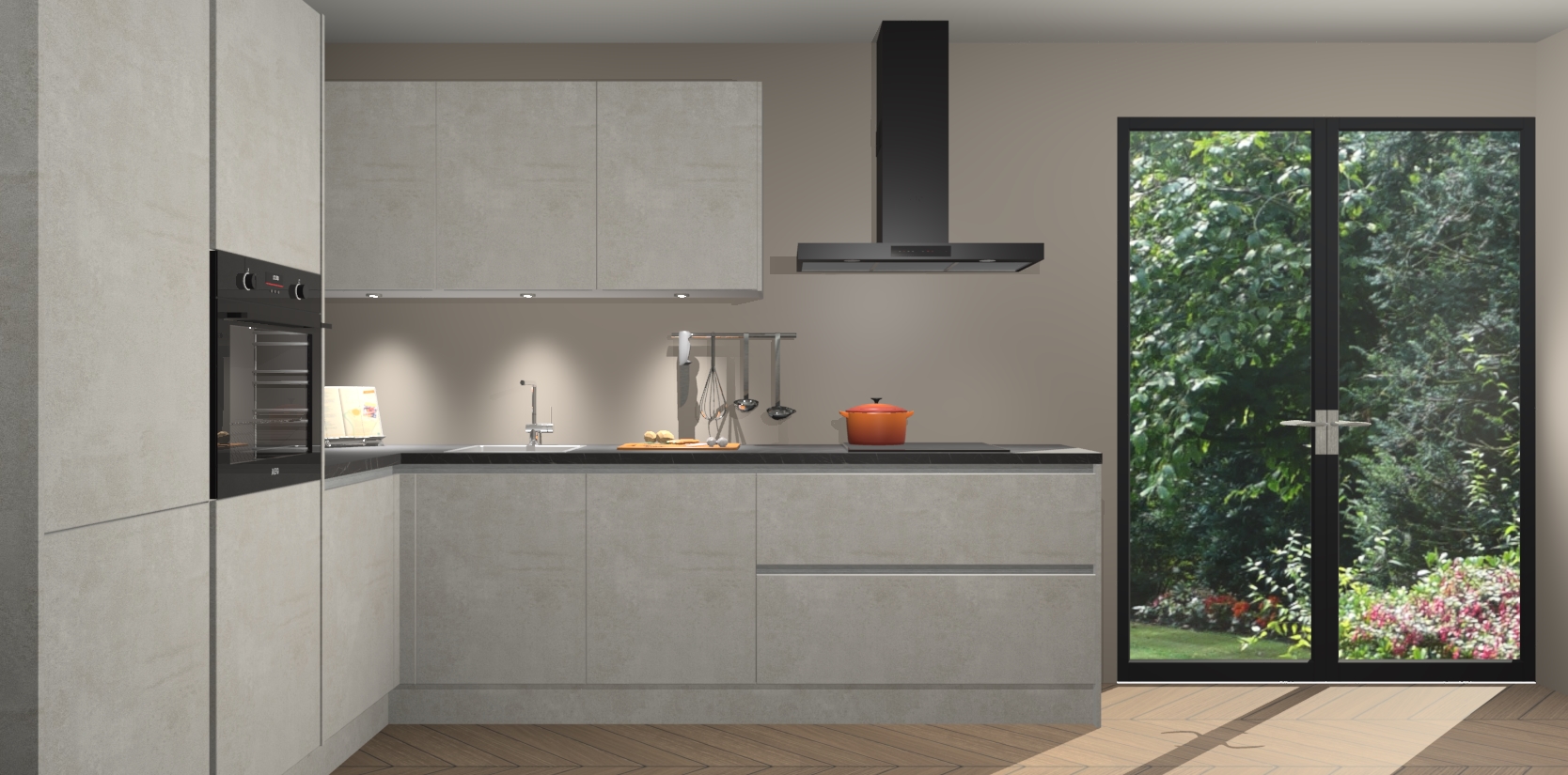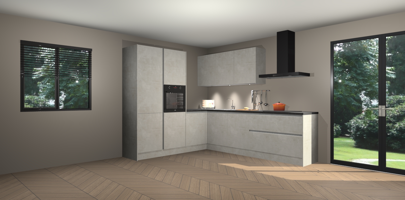 Maak kennis met de beton opaal greeploze keuken Parla - de perfecte aanvulling voor uw moderne keuken! Ervaar tijdloos design, elegantie en een chique uitstraling met onze zwarte handgrepen, soft-close deuren en veel opbergruimte. Dit alles wordt aangeboden tegen een vaste lage prijs voor ongeëvenaarde Duitse keukenkwaliteit!