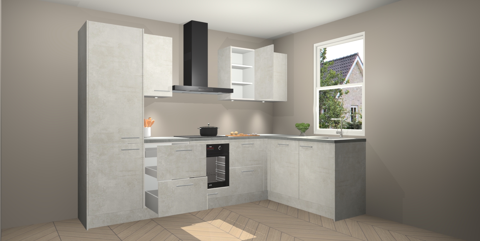 Maak kennis met de trendsettende en luxe Beton Opaal keuken Bazel! Deze uitzonderlijke keuken van Duitse kwaliteit is stijlvol, modern en perfect om elk huis mee op te fleuren. De binnenkant van de kasten worden meegenomen in een bijpassende kleur om een samenhangende eigentijdse esthetiek te voltooien. U zult dol zijn op hoe uw pas gerenoveerde keuken eruitziet met de Beton Opaal editie!