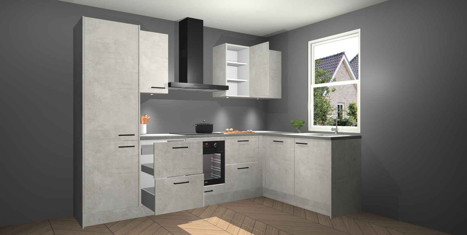 Maak kennis met de trendsettende en luxe Beton Opaal keuken Bazel! Deze uitzonderlijke keuken van Duitse kwaliteit is stijlvol, modern en perfect om elk huis mee op te fleuren. De binnenkant van de kasten worden meegenomen in een bijpassende kleur om een samenhangende eigentijdse esthetiek te voltooien. U zult dol zijn op hoe uw pas gerenoveerde keuken eruitziet met de Beton Opaal editie!