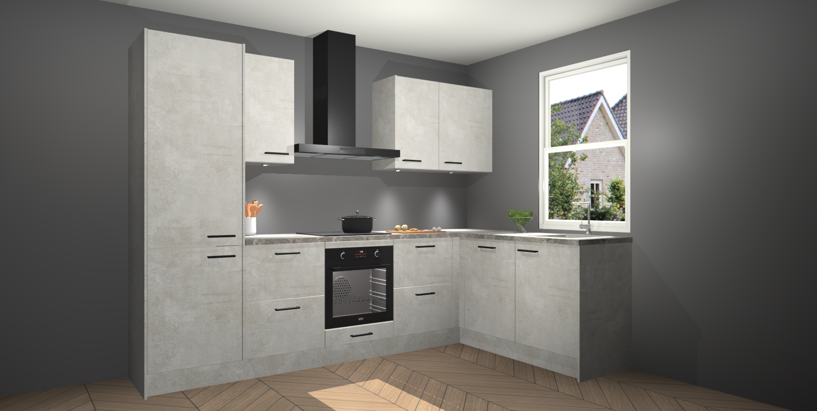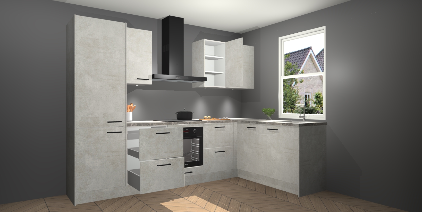 Maak kennis met de trendsettende en luxe Beton Opaal keuken Bazel! Deze uitzonderlijke keuken van Duitse kwaliteit is stijlvol, modern en perfect om elk huis mee op te fleuren. De binnenkant van de kasten worden meegenomen in een bijpassende kleur om een samenhangende eigentijdse esthetiek te voltooien. U zult dol zijn op hoe uw pas gerenoveerde keuken eruitziet met de Beton Opaal editie!