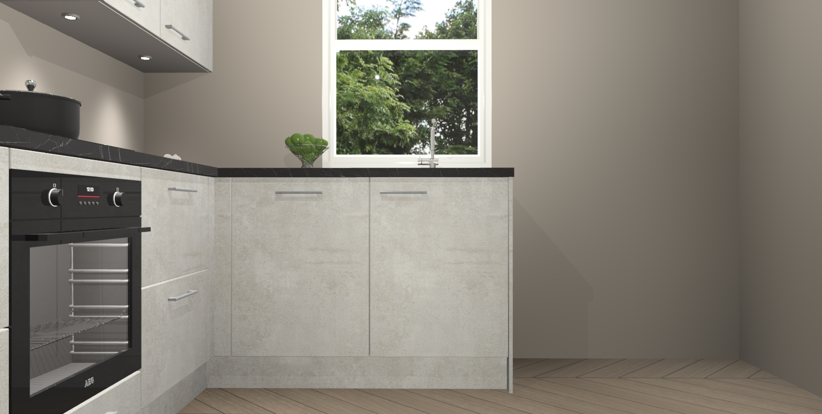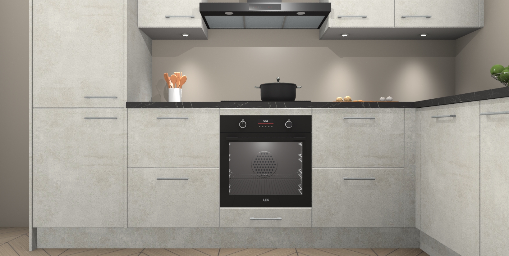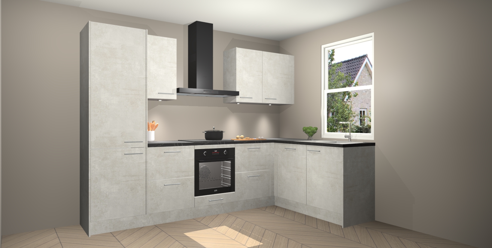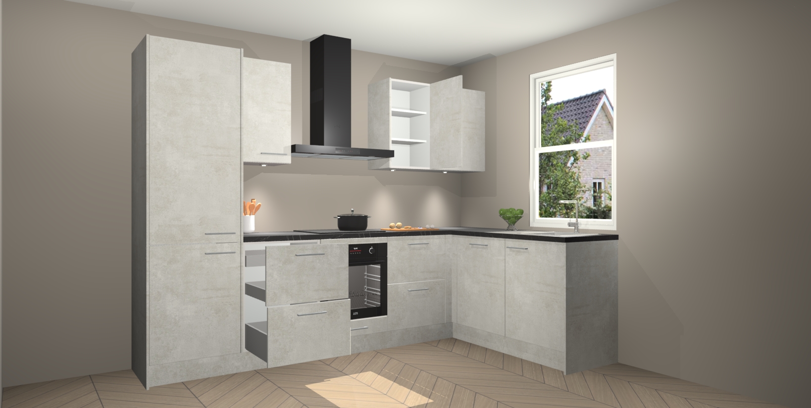 Maak kennis met de trendsettende en luxe Beton Opaal keuken Bazel! Deze uitzonderlijke keuken van Duitse kwaliteit is stijlvol, modern en perfect om elk huis mee op te fleuren. De binnenkant van de kasten worden meegenomen in een bijpassende kleur om een samenhangende eigentijdse esthetiek te voltooien. U zult dol zijn op hoe uw pas gerenoveerde keuken eruitziet met de Beton Opaal editie!