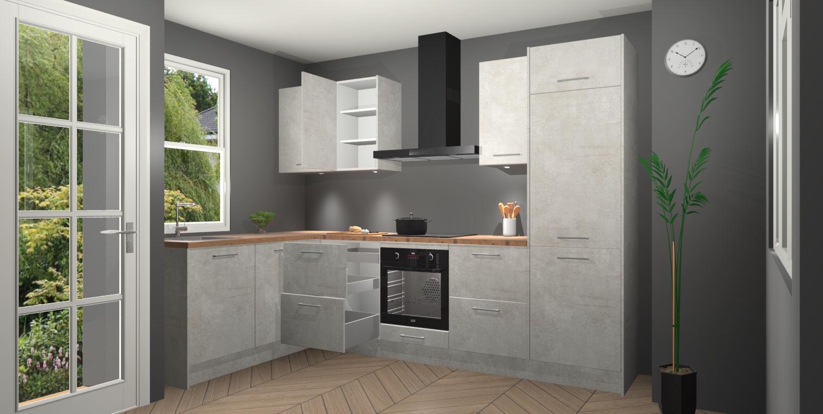 Bent u op zoek naar een strakke, moderne hoekkeuken die uw huis oppept en een moderne uitstraling geeft? Kijk dan niet verder dan de beton opaal keuken Beijing. Deze verbluffende hoekkeuken tilt hedendaags design naar een hoger niveau. Qua stijl is deze chique hoekkeuken voorzien van beton opaal accenten, om een strakke maar opvallende look te creëren. De binnenkant van de kasten is afgewerkt in dezelfde prachtige beton opaal kleur voor extra esthetische aantrekkingskracht.