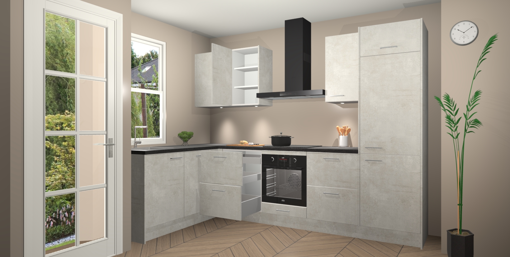 Bent u op zoek naar een strakke, moderne hoekkeuken die uw huis oppept en een moderne uitstraling geeft? Kijk dan niet verder dan de beton opaal keuken Beijing. Deze verbluffende hoekkeuken tilt hedendaags design naar een hoger niveau. Qua stijl is deze chique hoekkeuken voorzien van beton opaal accenten, om een strakke maar opvallende look te creëren. De binnenkant van de kasten is afgewerkt in dezelfde prachtige beton opaal kleur voor extra esthetische aantrekkingskracht.