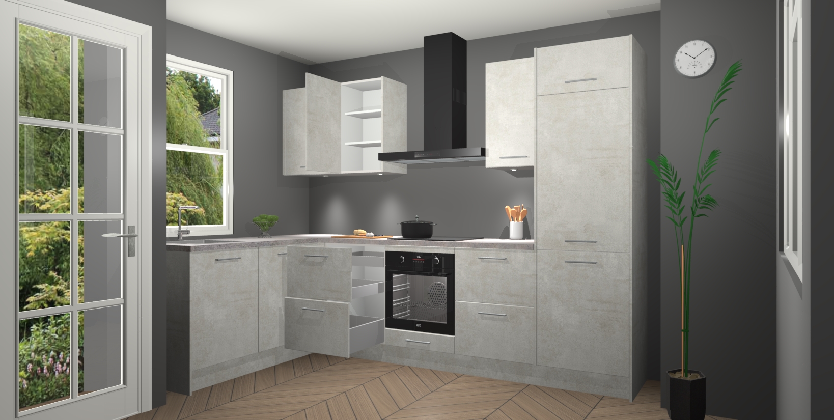 Bent u op zoek naar een strakke, moderne hoekkeuken die uw huis oppept en een moderne uitstraling geeft? Kijk dan niet verder dan de beton opaal keuken Beijing. Deze verbluffende hoekkeuken tilt hedendaags design naar een hoger niveau. Qua stijl is deze chique hoekkeuken voorzien van beton opaal accenten, om een strakke maar opvallende look te creëren. De binnenkant van de kasten is afgewerkt in dezelfde prachtige beton opaal kleur voor extra esthetische aantrekkingskracht.