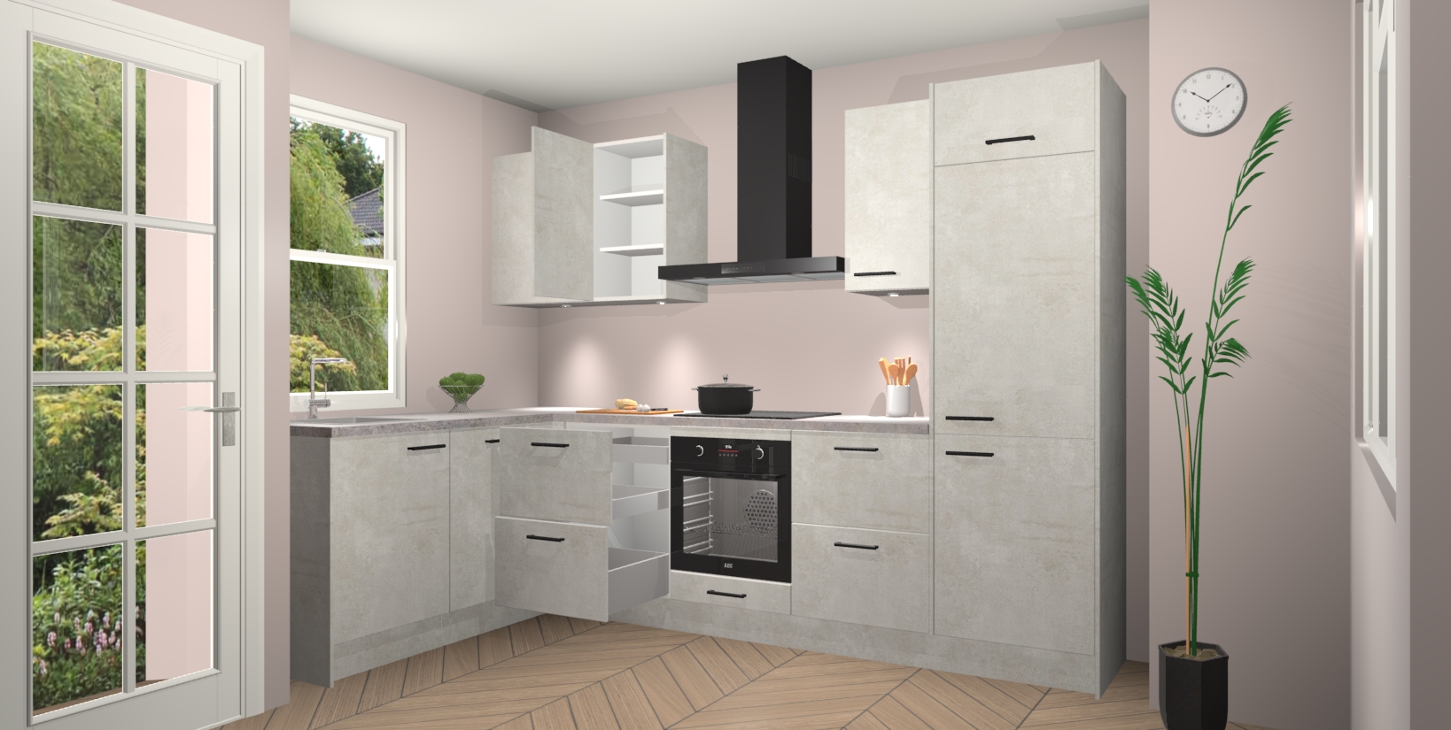 Bent u op zoek naar een strakke, moderne hoekkeuken die uw huis oppept en een moderne uitstraling geeft? Kijk dan niet verder dan de beton opaal keuken Beijing. Deze verbluffende hoekkeuken tilt hedendaags design naar een hoger niveau. Qua stijl is deze chique hoekkeuken voorzien van beton opaal accenten, om een strakke maar opvallende look te creëren. De binnenkant van de kasten is afgewerkt in dezelfde prachtige beton opaal kleur voor extra esthetische aantrekkingskracht.