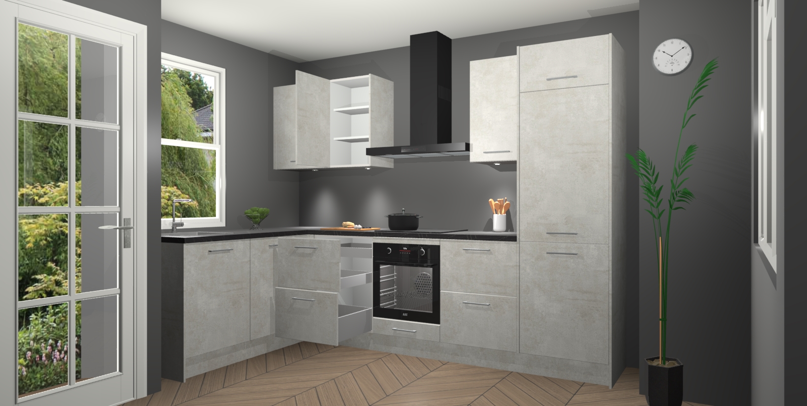 U hoeft zich ook geen zorgen te maken over een gebrek aan opbergruimte, want deze keuken heeft voldoende opbergmogelijkheden zowel boven als onder het aanrecht. Om het leven nog makkelijker te maken, wordt deze moderne hoekkeuken geleverd met 5 ingebouwde apparaten, waaronder een oven, inductiekookplaat, afzuigkap, vaatwasser en koelkast, zodat u in een mum van tijd klaar bent voor actie!