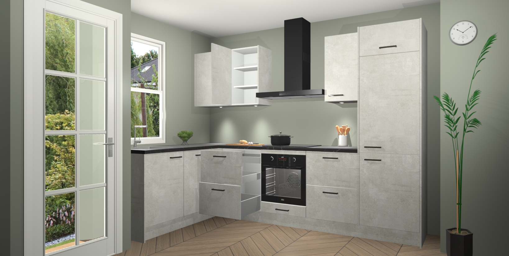 U hoeft zich ook geen zorgen te maken over een gebrek aan opbergruimte, want deze keuken heeft voldoende opbergmogelijkheden zowel boven als onder het aanrecht. Om het leven nog makkelijker te maken, wordt deze moderne hoekkeuken geleverd met 5 ingebouwde apparaten, waaronder een oven, inductiekookplaat, afzuigkap, vaatwasser en koelkast, zodat u in een mum van tijd klaar bent voor actie!