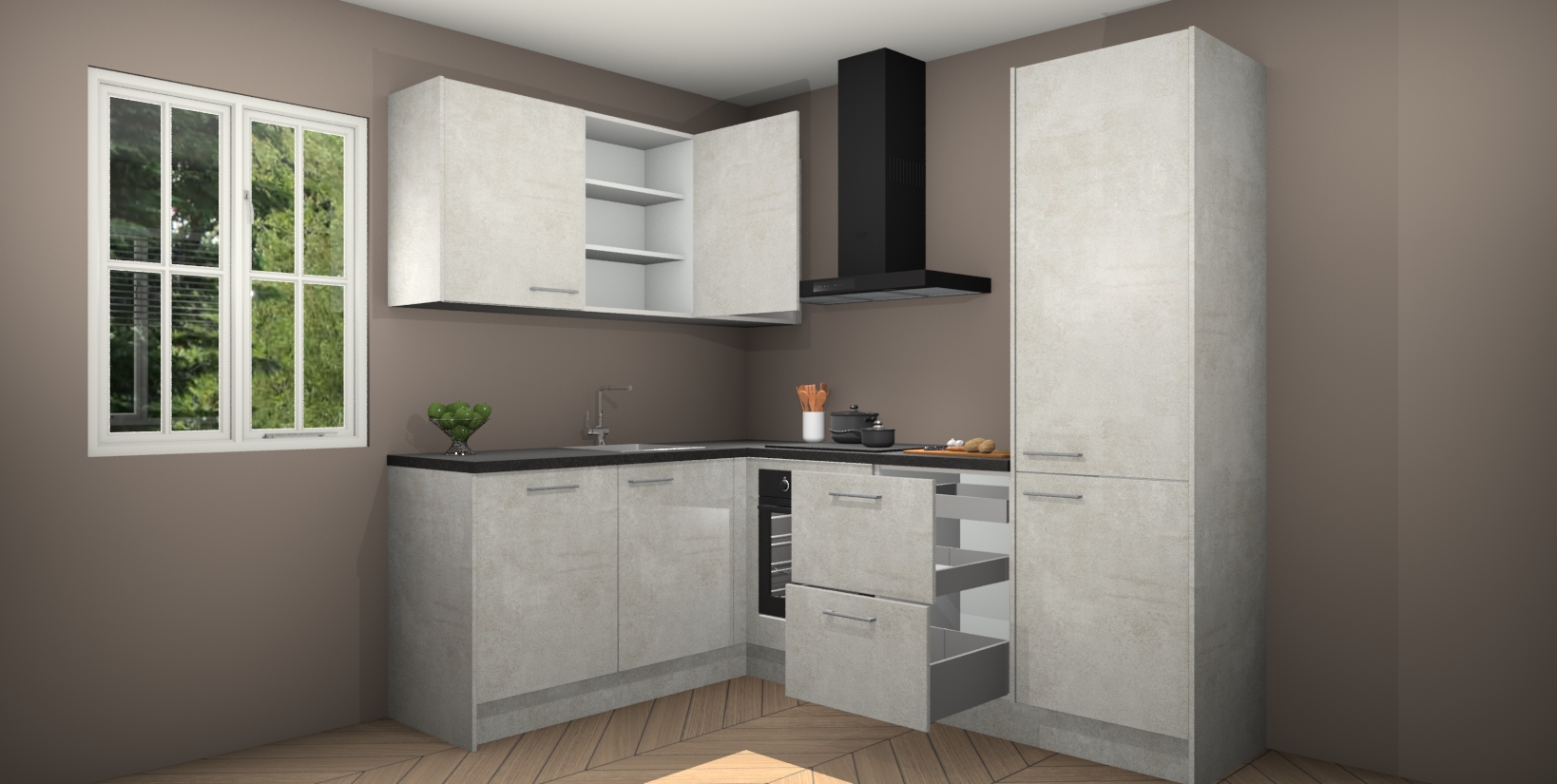 Maak kennis met de Beton Opaal keuken Boekarest, een moderne hoekkeuken waar al uw vrienden en familie jaloers op zullen zijn! Het verbluffende mooie ontwerp past in elk interieur en is een ideale keuze voor wie op zoek is naar een klassieke, maar verfijnde look.