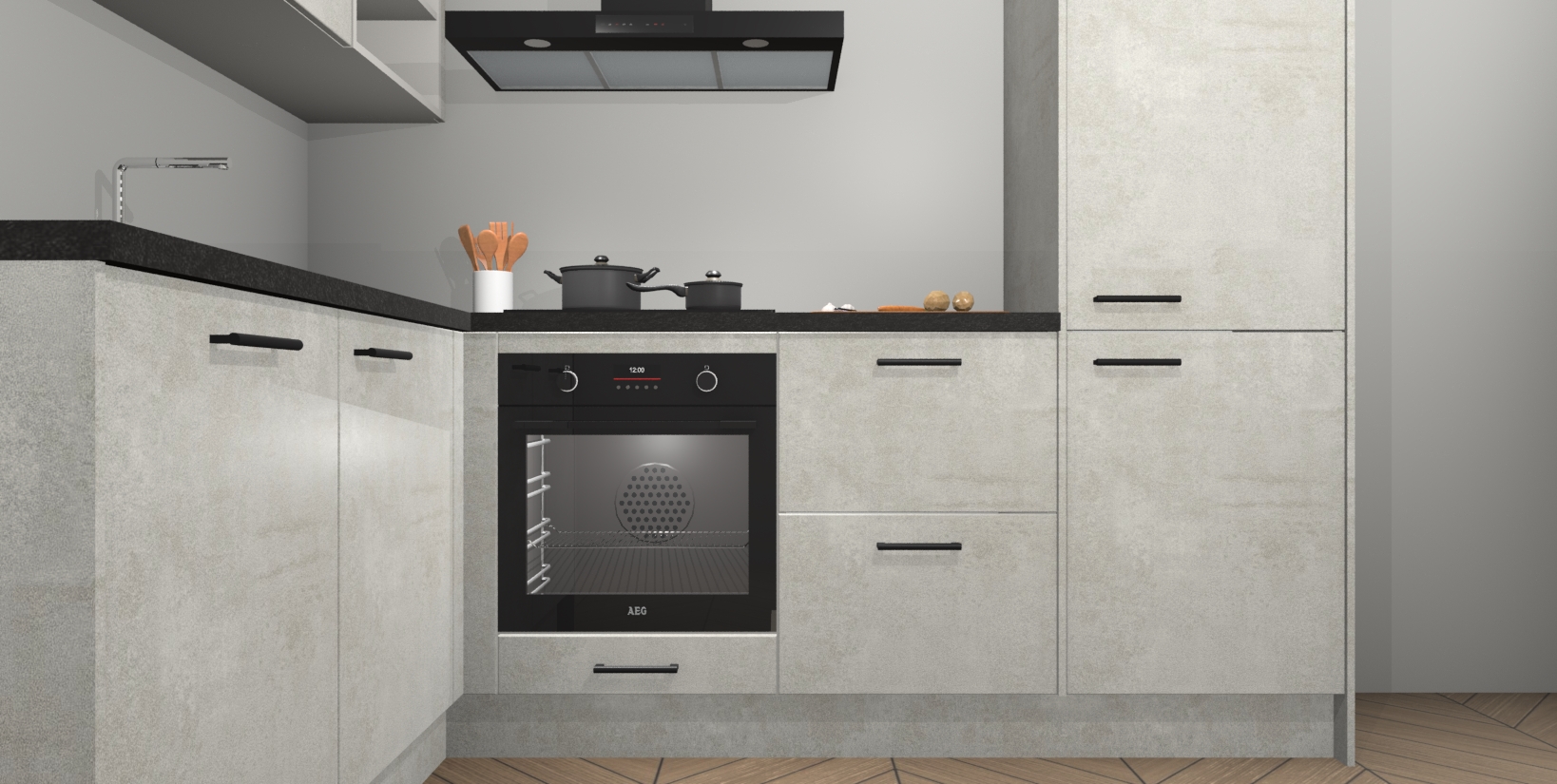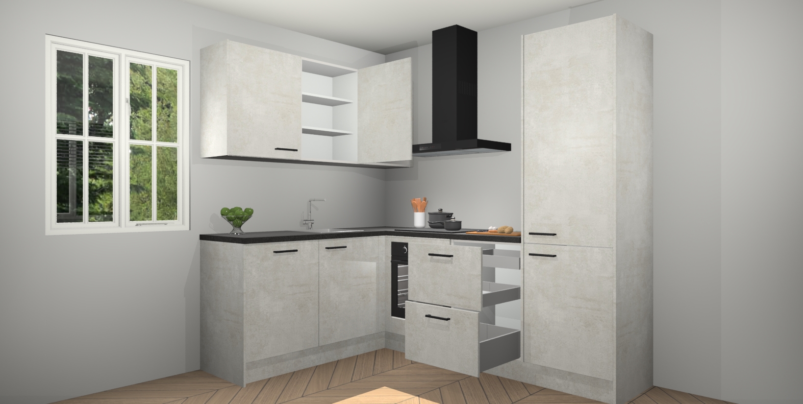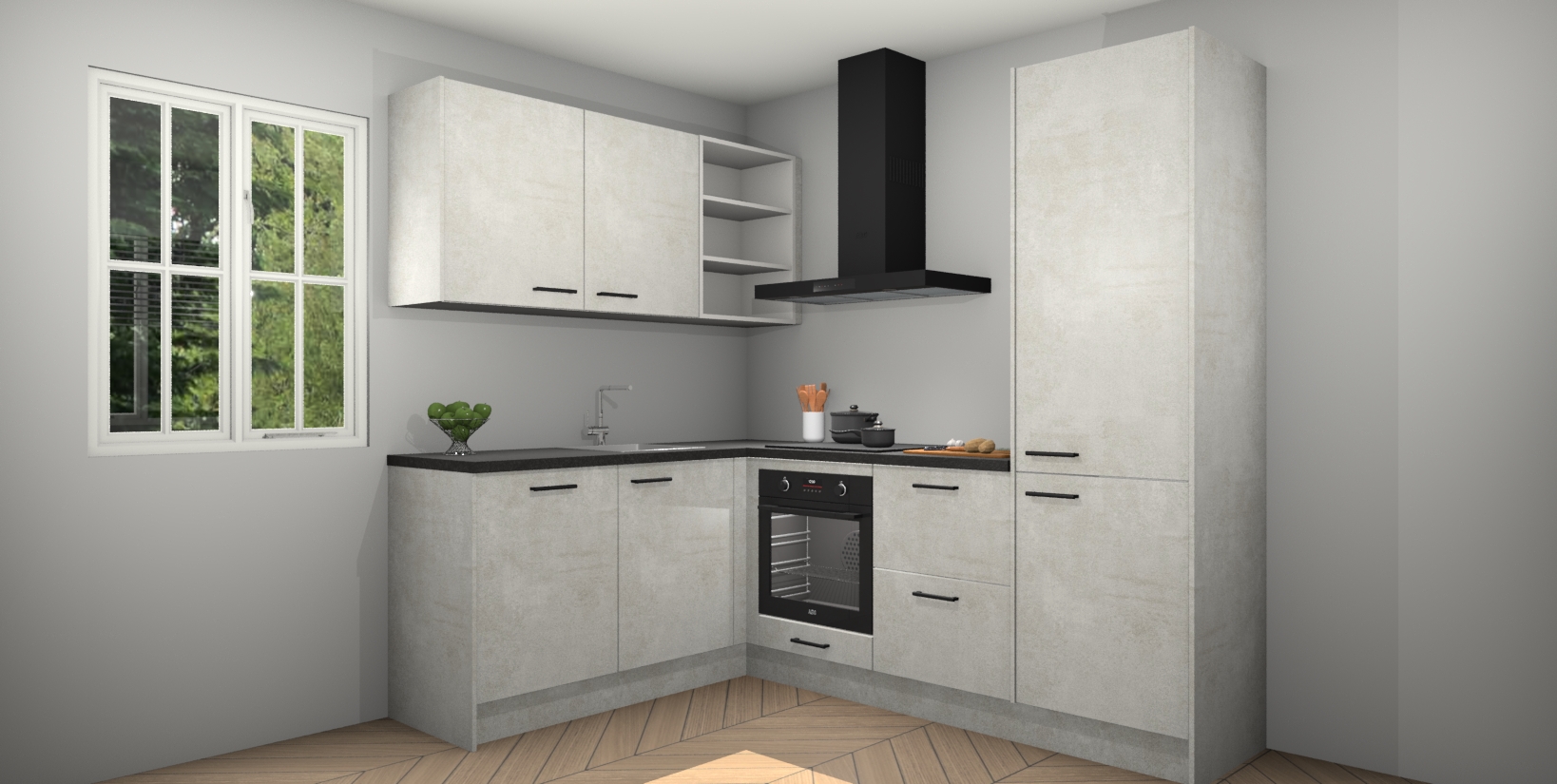 Maak kennis met de Beton Opaal keuken Boekarest, een moderne hoekkeuken waar al uw vrienden en familie jaloers op zullen zijn! Het verbluffende mooie ontwerp past in elk interieur en is een ideale keuze voor wie op zoek is naar een klassieke, maar verfijnde look.