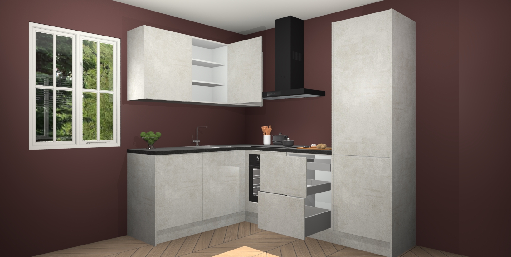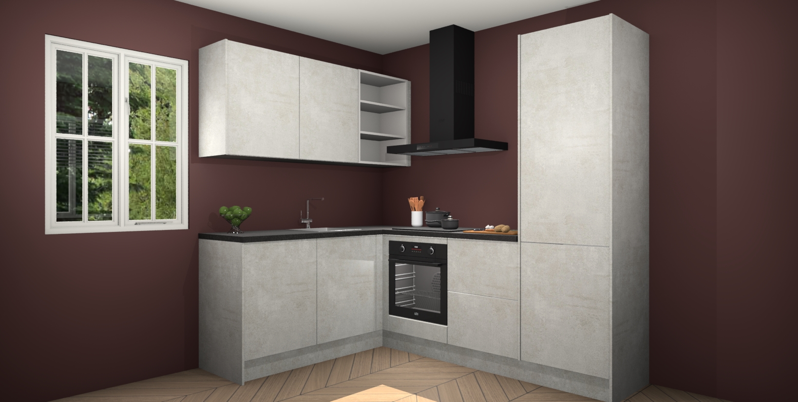 Maak kennis met de Beton Opaal keuken Boekarest, een moderne hoekkeuken waar al uw vrienden en familie jaloers op zullen zijn! Het verbluffende mooie ontwerp past in elk interieur en is een ideale keuze voor wie op zoek is naar een klassieke, maar verfijnde look.