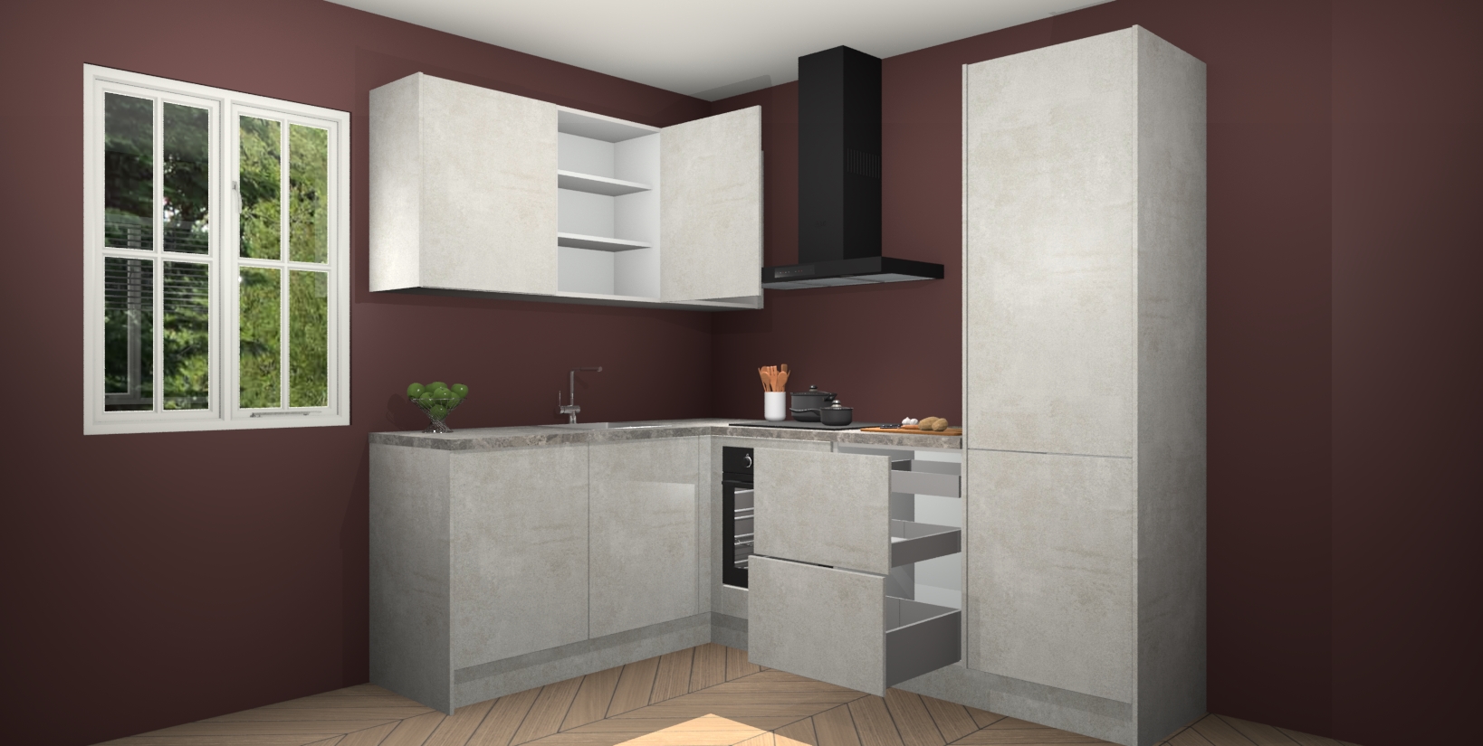 Maak kennis met de Beton Opaal keuken Boekarest, een moderne hoekkeuken waar al uw vrienden en familie jaloers op zullen zijn! Het verbluffende mooie ontwerp past in elk interieur en is een ideale keuze voor wie op zoek is naar een klassieke, maar verfijnde look.
