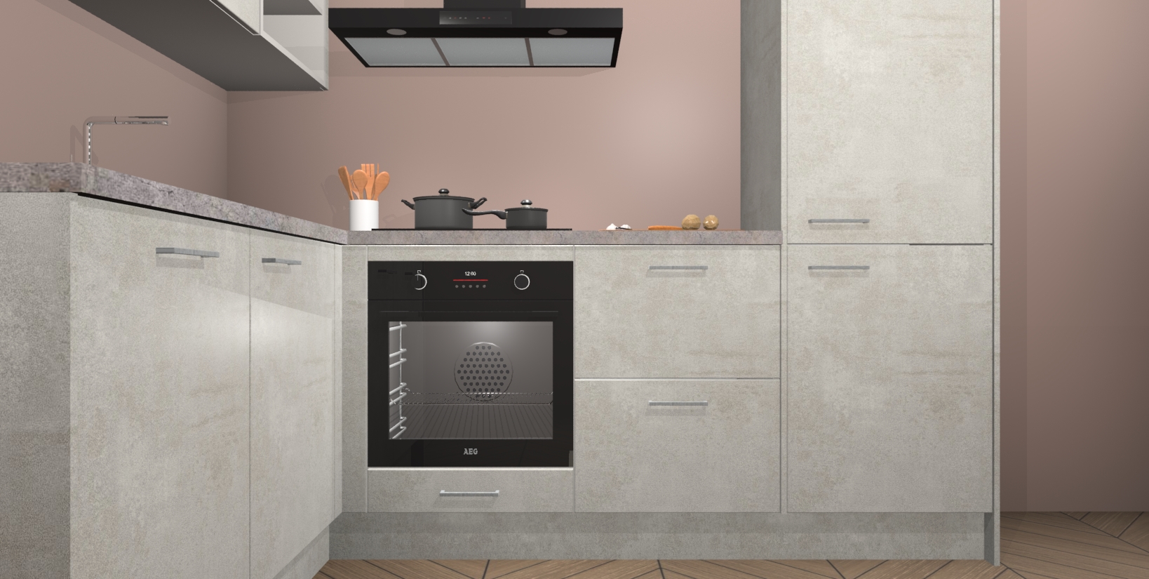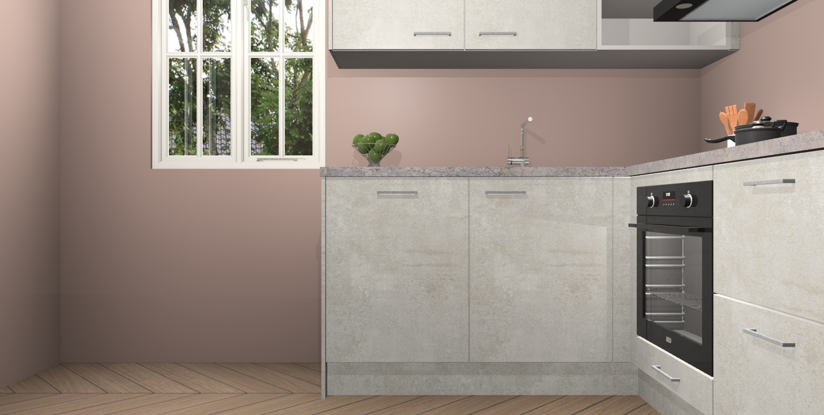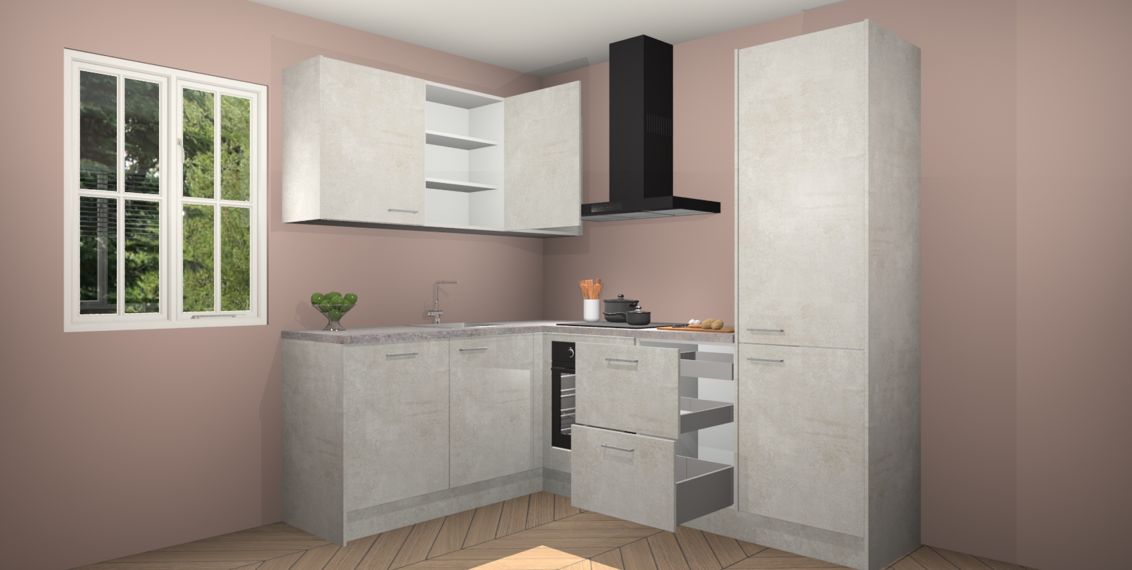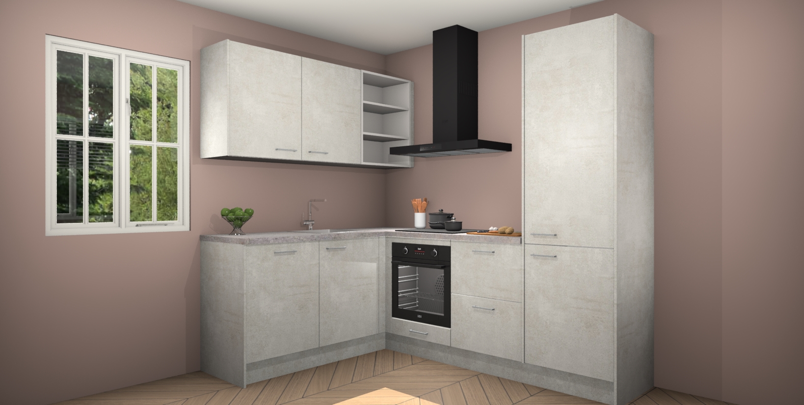 Maak kennis met de Beton Opaal keuken Boekarest, een moderne hoekkeuken waar al uw vrienden en familie jaloers op zullen zijn! Het verbluffende mooie ontwerp past in elk interieur en is een ideale keuze voor wie op zoek is naar een klassieke, maar verfijnde look.