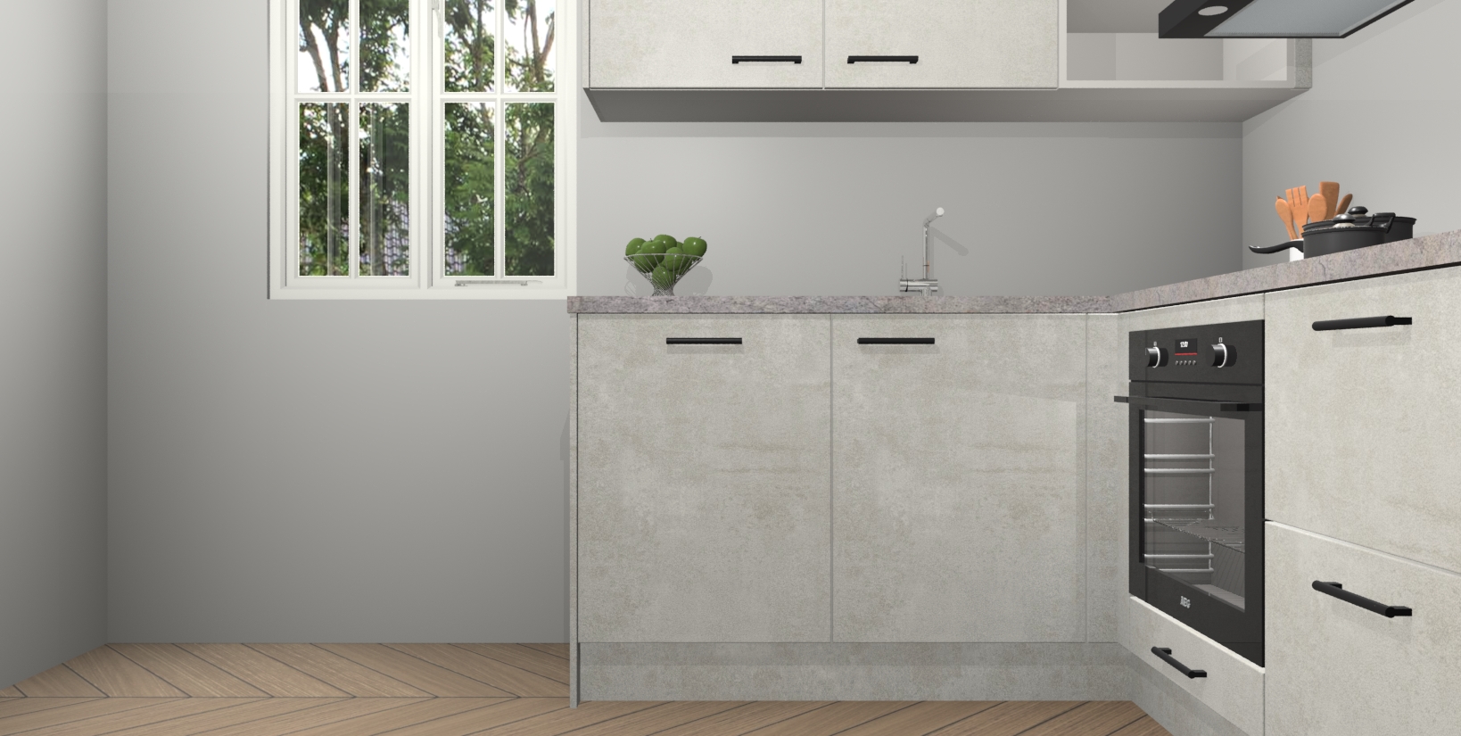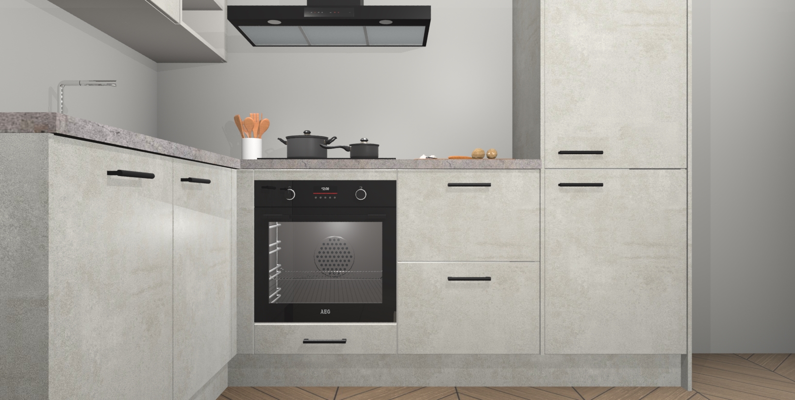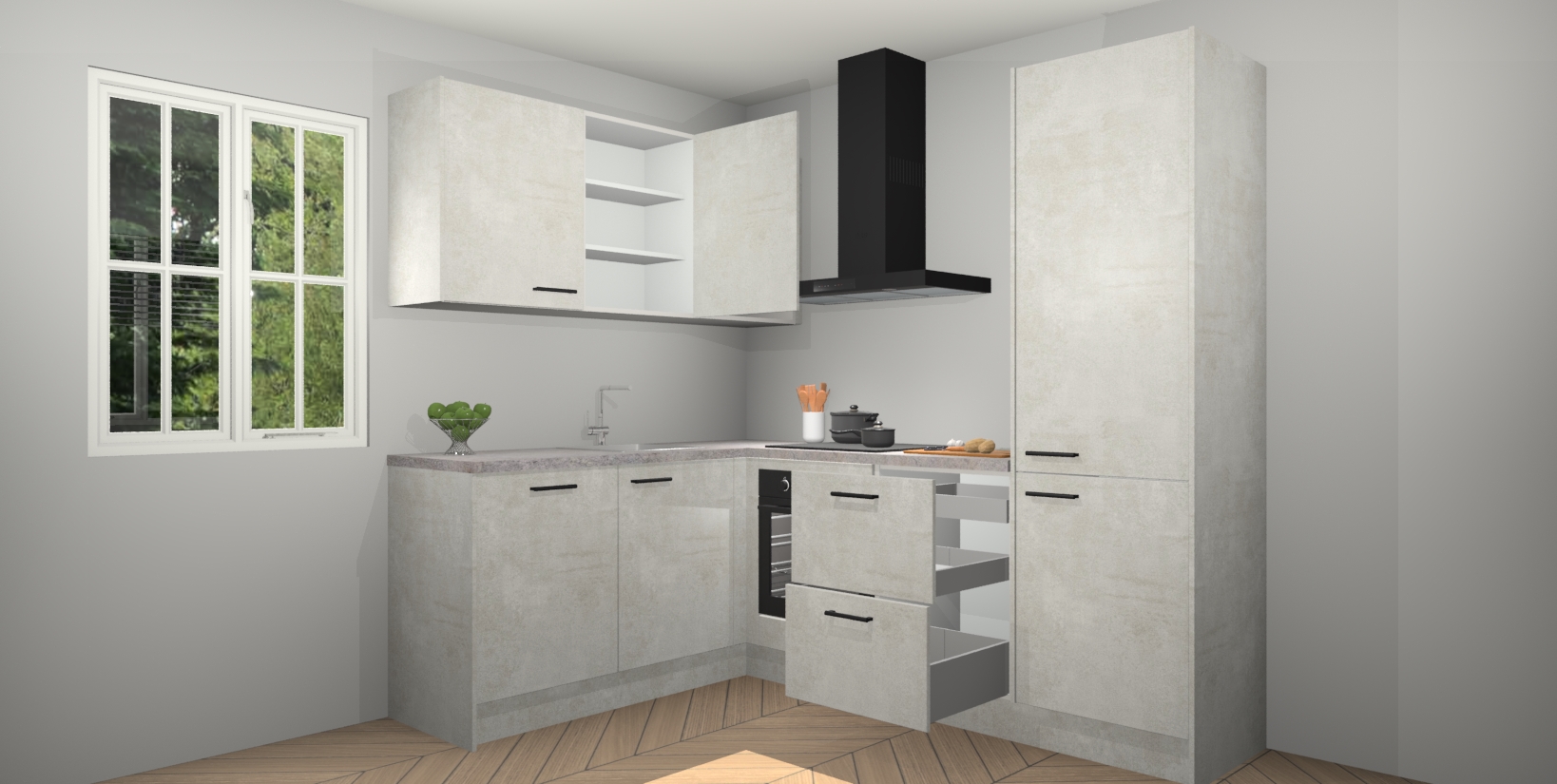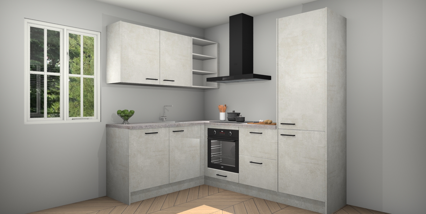 Maak kennis met de Beton Opaal keuken Boekarest, een moderne hoekkeuken waar al uw vrienden en familie jaloers op zullen zijn! Het verbluffende mooie ontwerp past in elk interieur en is een ideale keuze voor wie op zoek is naar een klassieke, maar verfijnde look.