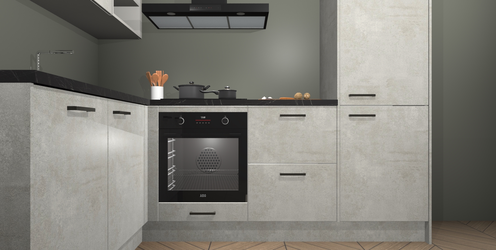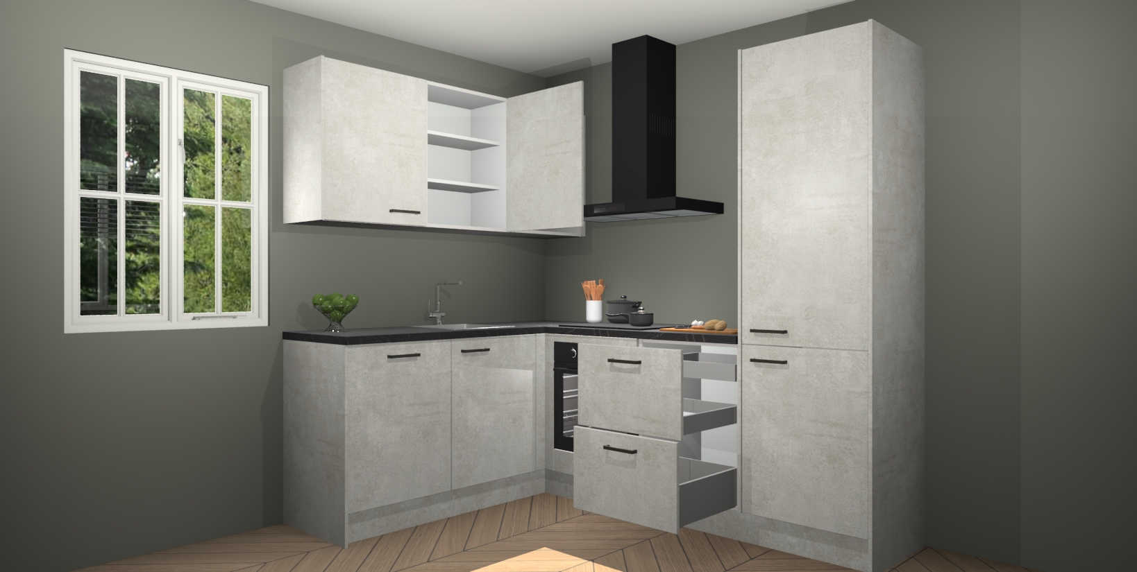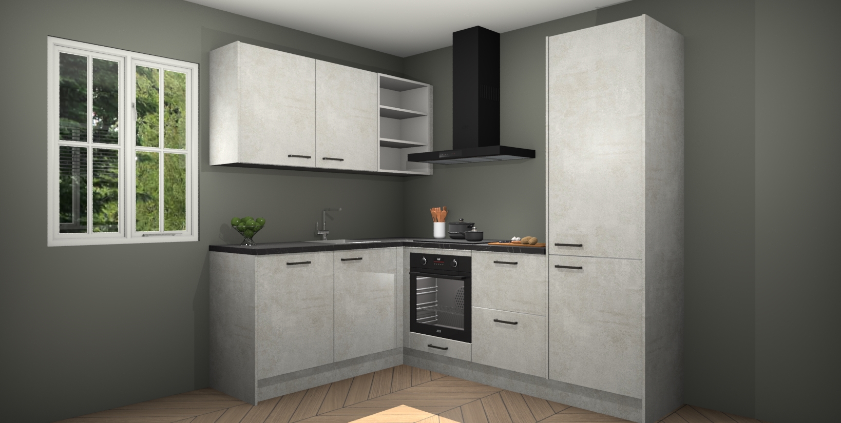 Maak kennis met de Beton Opaal keuken Boekarest, een moderne hoekkeuken waar al uw vrienden en familie jaloers op zullen zijn! Het verbluffende mooie ontwerp past in elk interieur en is een ideale keuze voor wie op zoek is naar een klassieke, maar verfijnde look.