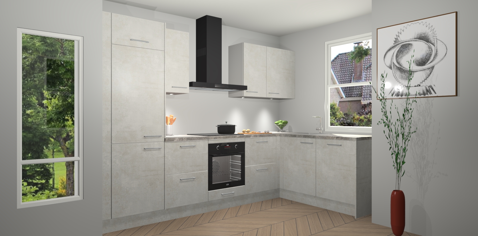 De Beton Opaal keuken Geneve is precies wat u nodig heeft als u op zoek bent naar modern design, versmolten met tijdloze schoonheid. De strakke afwerking voegt klasse toe terwijl het toch een uitnodigende sfeer behoudt; zeker om zowel gasten als uzelf te inspireren om in stijl te gaan koken! En nog beter, het zal uw budget niet breken - dus waarom wachten? Met de Beton Opaal keuken Geneve bent u verzekerd van kwaliteit zonder in te leveren op de prijs!