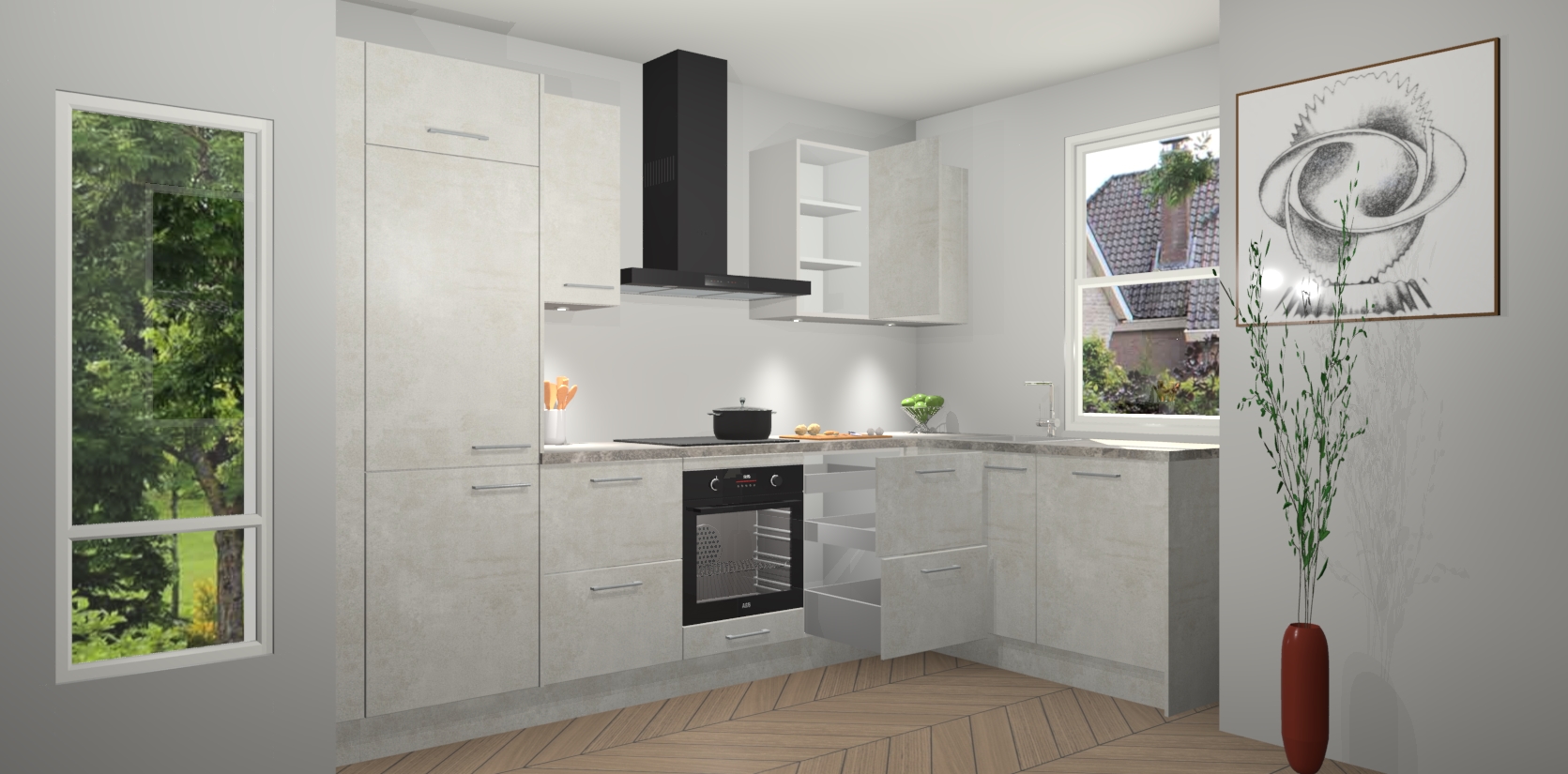 De Beton Opaal keuken Geneve is uitgerust met 5 inbouwapparaten - een oven, inductiekookplaat, afzuigkap, vaatwasser en koelkast - voor al uw kook- en bewaarbehoeftes. U kunt deze apparaten desgewenst eenvoudig upgraden naar AEG of de oven omruilen voor een combimagnetron na het plaatsen van uw bestelling. En met de soft close deuren, voldoende opbergruimte en kasten die voorgemonteerd worden geleverd, bent u in een mum van tijd klaar om heerlijke maaltijden te bereiden!