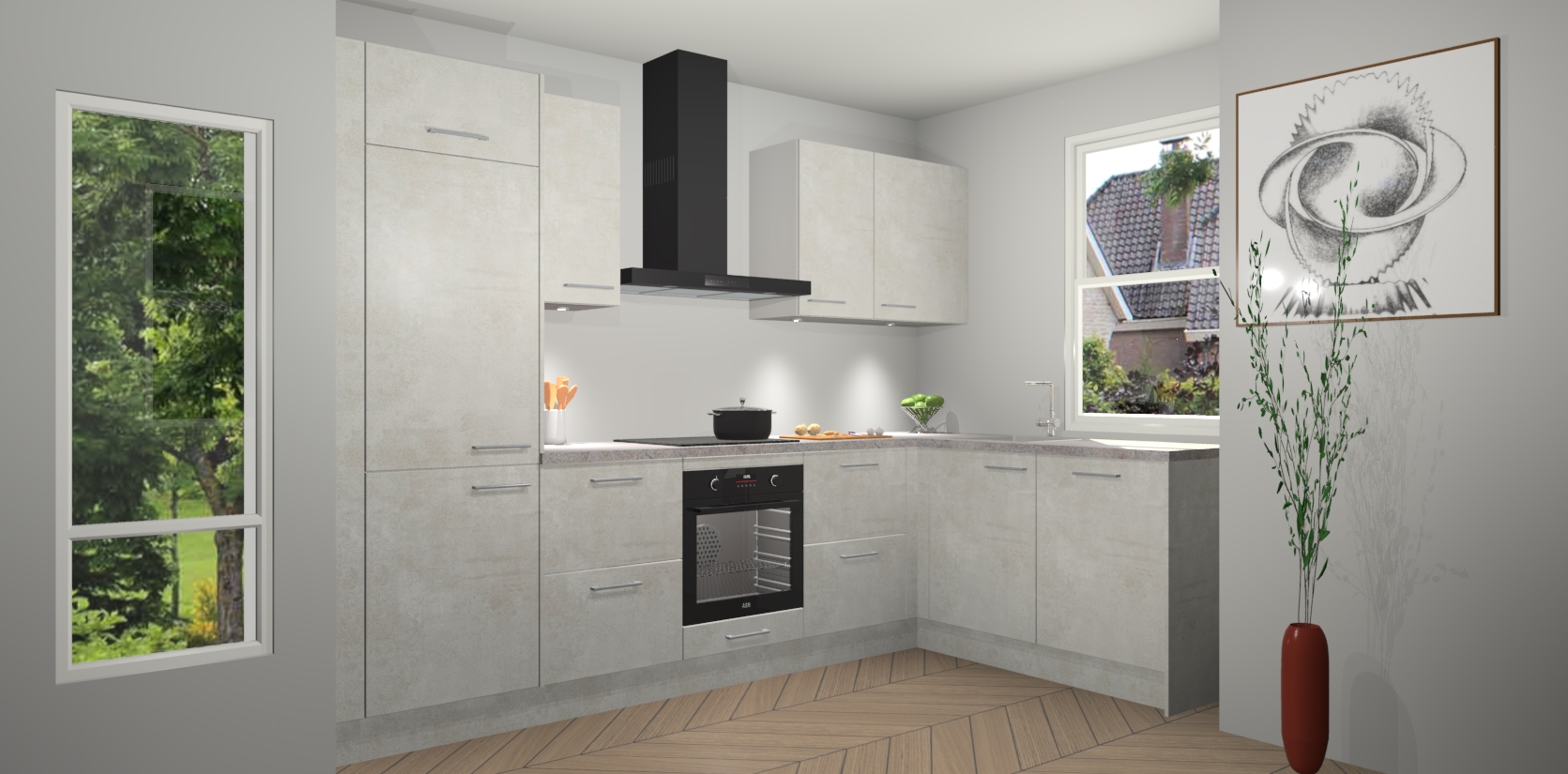 De Beton Opaal keuken Geneve is precies wat u nodig heeft als u op zoek bent naar modern design, versmolten met tijdloze schoonheid. De strakke afwerking voegt klasse toe terwijl het toch een uitnodigende sfeer behoudt; zeker om zowel gasten als uzelf te inspireren om in stijl te gaan koken! En nog beter, het zal uw budget niet breken - dus waarom wachten? Met de Beton Opaal keuken Geneve bent u verzekerd van kwaliteit zonder in te leveren op de prijs!