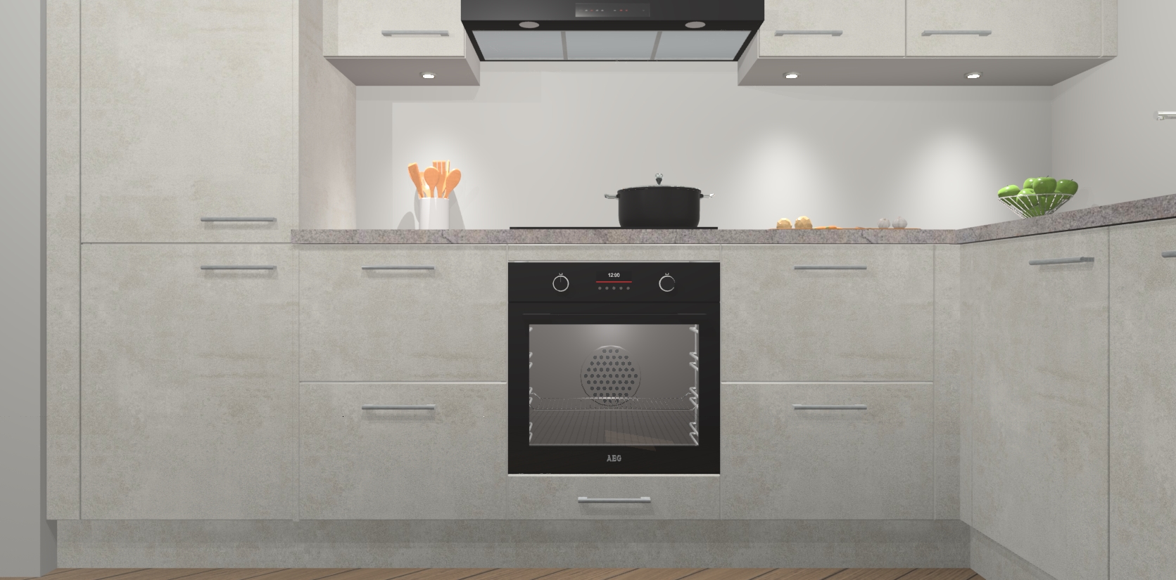 De Beton Opaal keuken Geneve is uitgerust met 5 inbouwapparaten - een oven, inductiekookplaat, afzuigkap, vaatwasser en koelkast - voor al uw kook- en bewaarbehoeftes. U kunt deze apparaten desgewenst eenvoudig upgraden naar AEG of de oven omruilen voor een combimagnetron na het plaatsen van uw bestelling. En met de soft close deuren, voldoende opbergruimte en kasten die voorgemonteerd worden geleverd, bent u in een mum van tijd klaar om heerlijke maaltijden te bereiden!