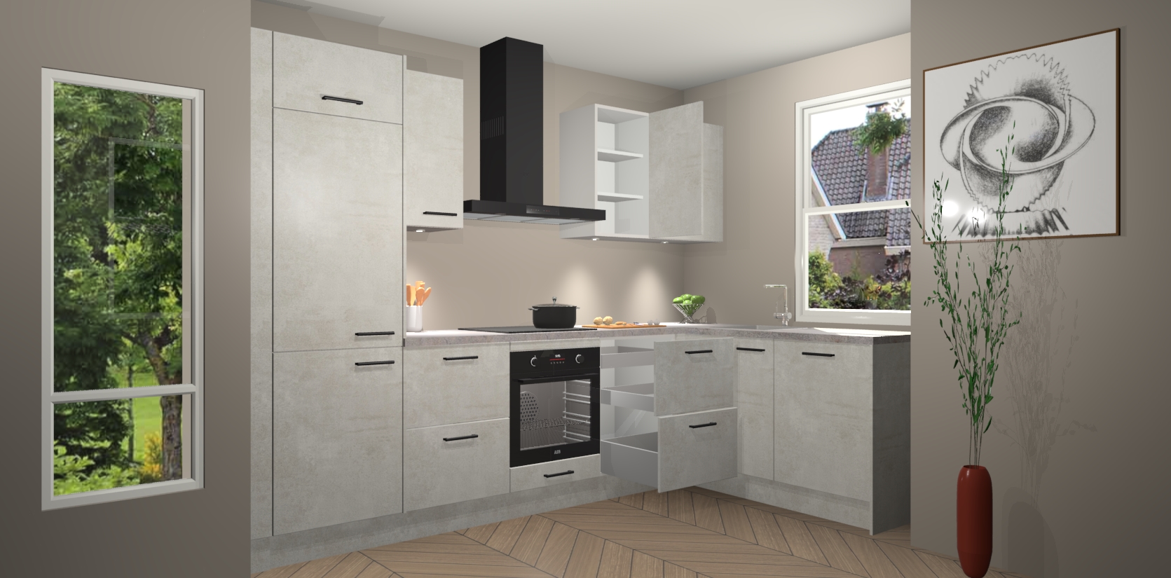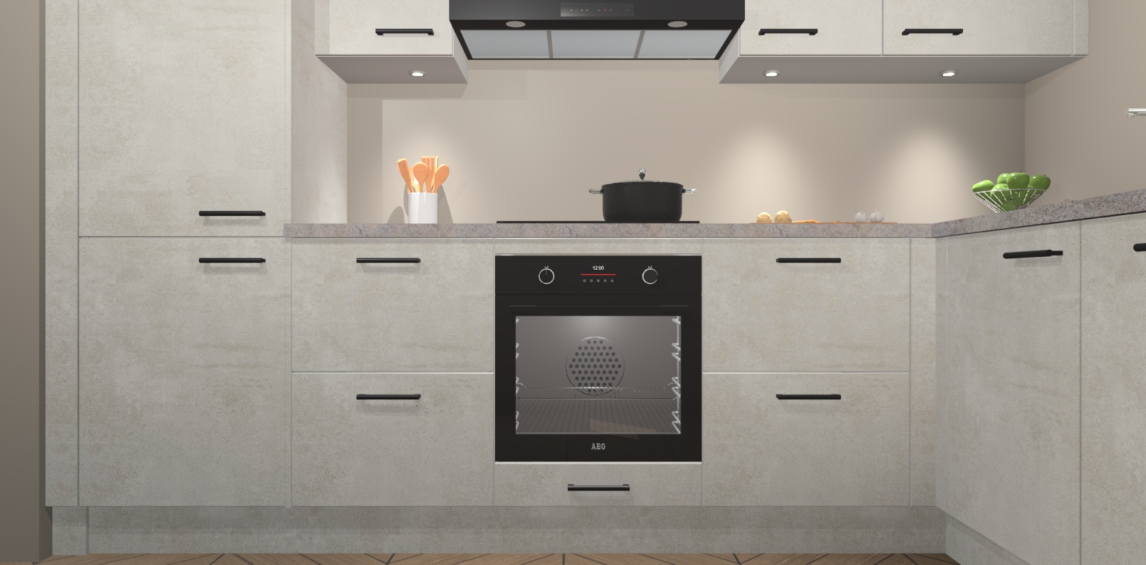 De Beton Opaal keuken Geneve is uitgerust met 5 inbouwapparaten - een oven, inductiekookplaat, afzuigkap, vaatwasser en koelkast - voor al uw kook- en bewaarbehoeftes. U kunt deze apparaten desgewenst eenvoudig upgraden naar AEG of de oven omruilen voor een combimagnetron na het plaatsen van uw bestelling. En met de soft close deuren, voldoende opbergruimte en kasten die voorgemonteerd worden geleverd, bent u in een mum van tijd klaar om heerlijke maaltijden te bereiden!