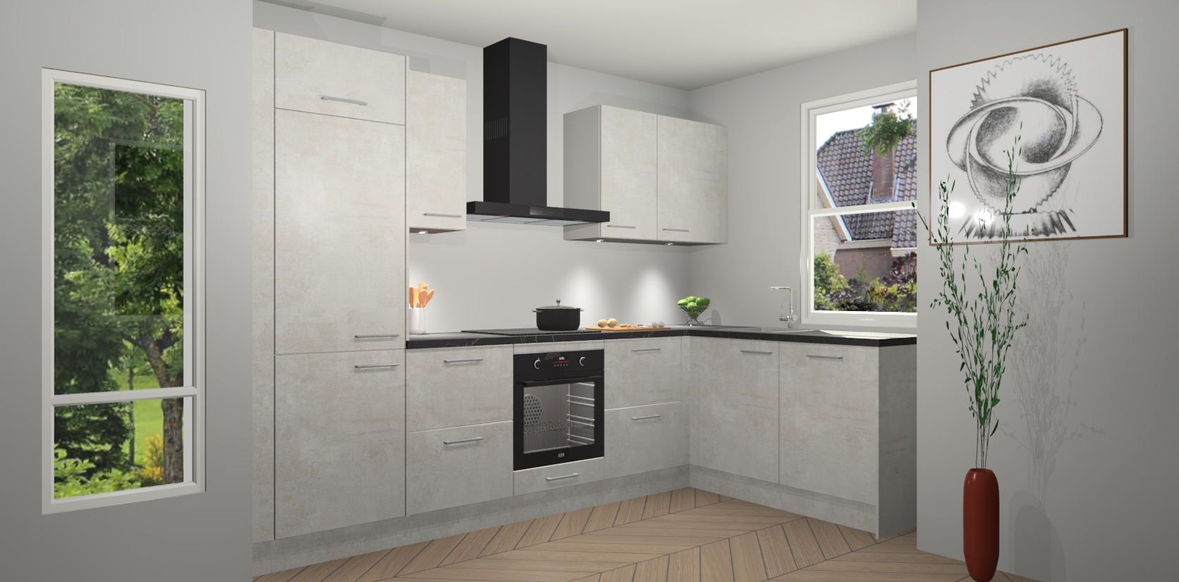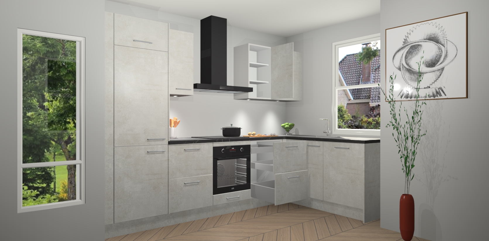De Beton Opaal keuken Geneve is precies wat u nodig heeft als u op zoek bent naar modern design, versmolten met tijdloze schoonheid. De strakke afwerking voegt klasse toe terwijl het toch een uitnodigende sfeer behoudt; zeker om zowel gasten als uzelf te inspireren om in stijl te gaan koken! En nog beter, het zal uw budget niet breken - dus waarom wachten? Met de Beton Opaal keuken Geneve bent u verzekerd van kwaliteit zonder in te leveren op de prijs!