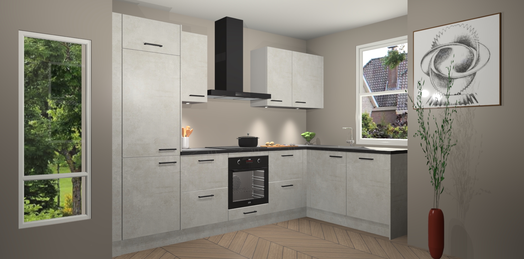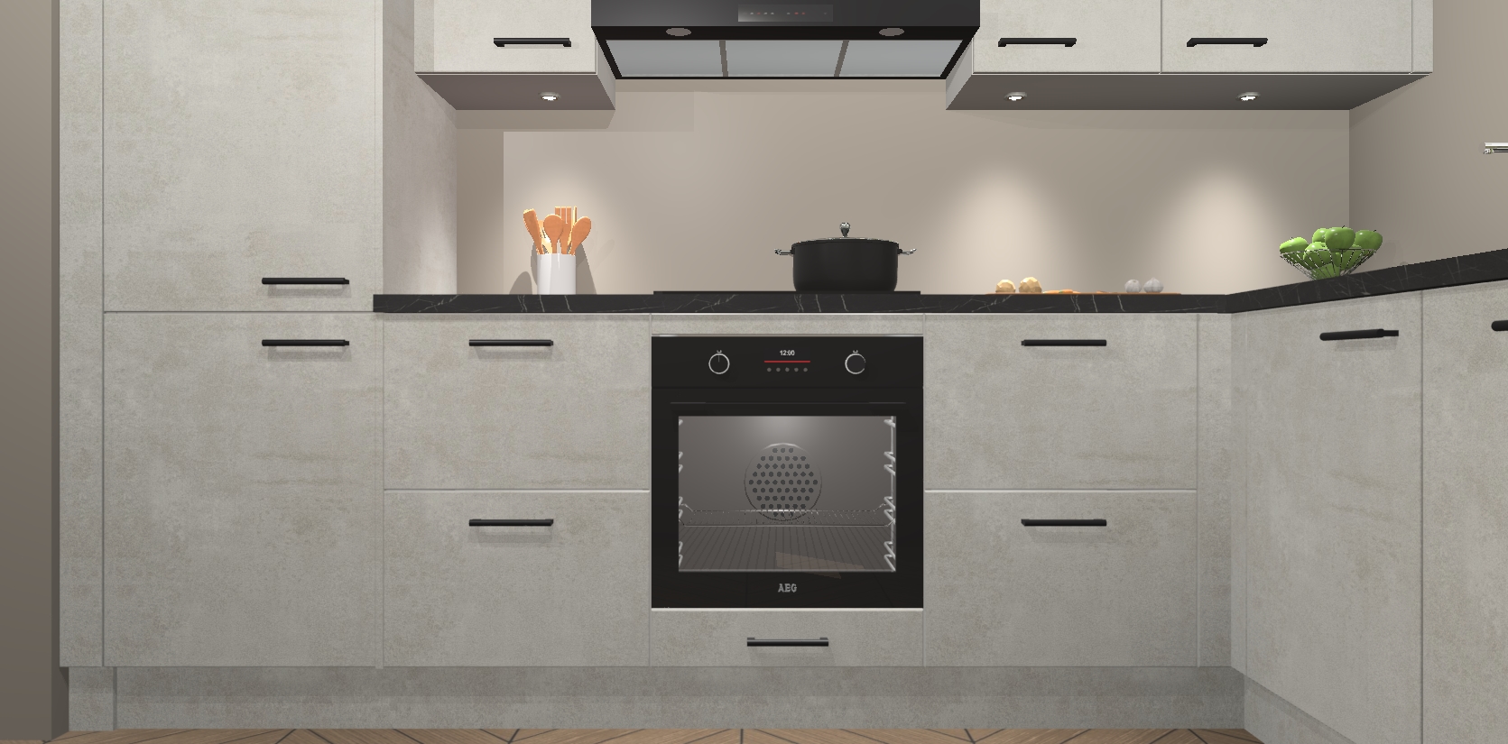 De Beton Opaal keuken Geneve is uitgerust met 5 inbouwapparaten - een oven, inductiekookplaat, afzuigkap, vaatwasser en koelkast - voor al uw kook- en bewaarbehoeftes. U kunt deze apparaten desgewenst eenvoudig upgraden naar AEG of de oven omruilen voor een combimagnetron na het plaatsen van uw bestelling. En met de soft close deuren, voldoende opbergruimte en kasten die voorgemonteerd worden geleverd, bent u in een mum van tijd klaar om heerlijke maaltijden te bereiden!