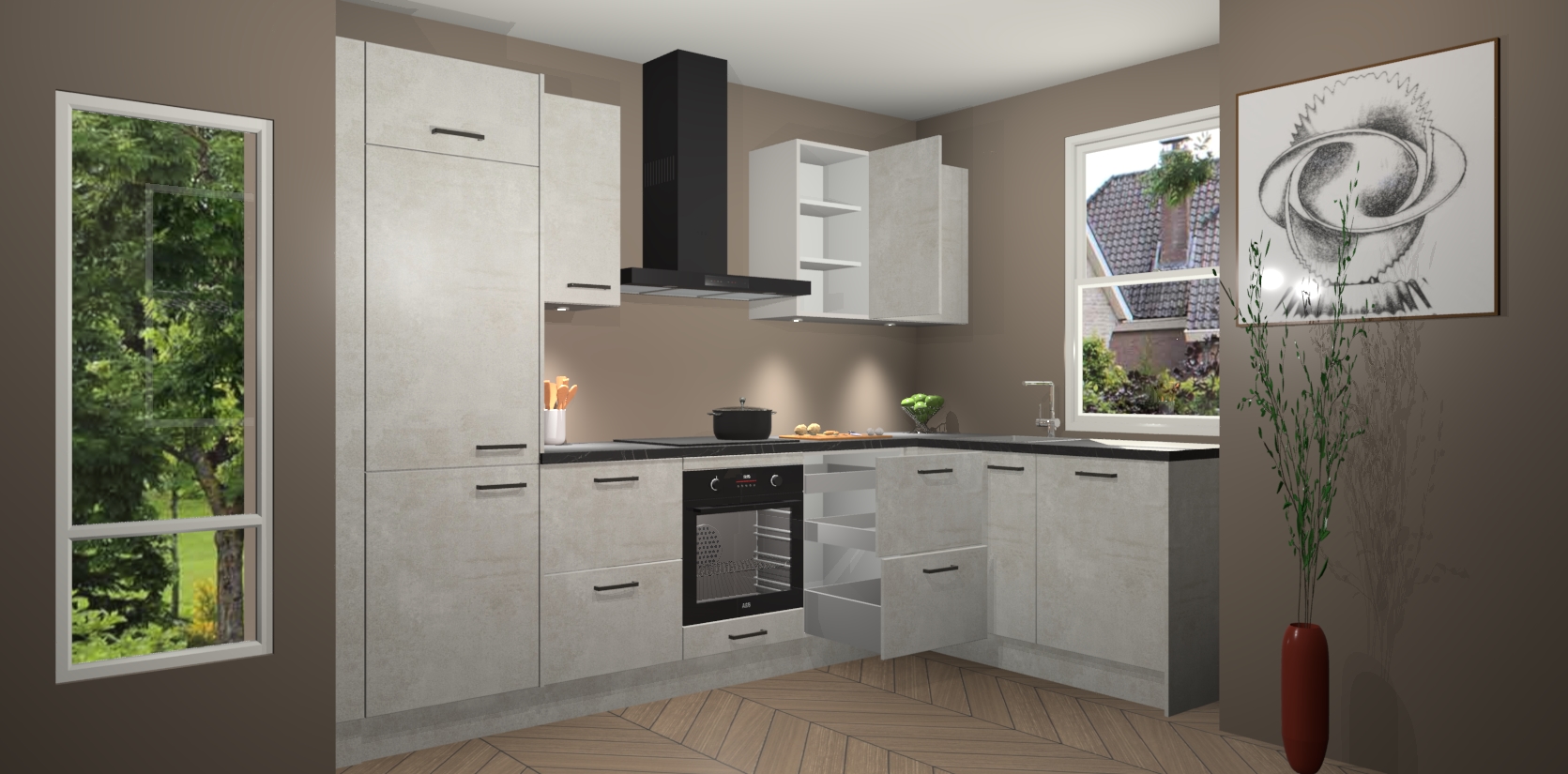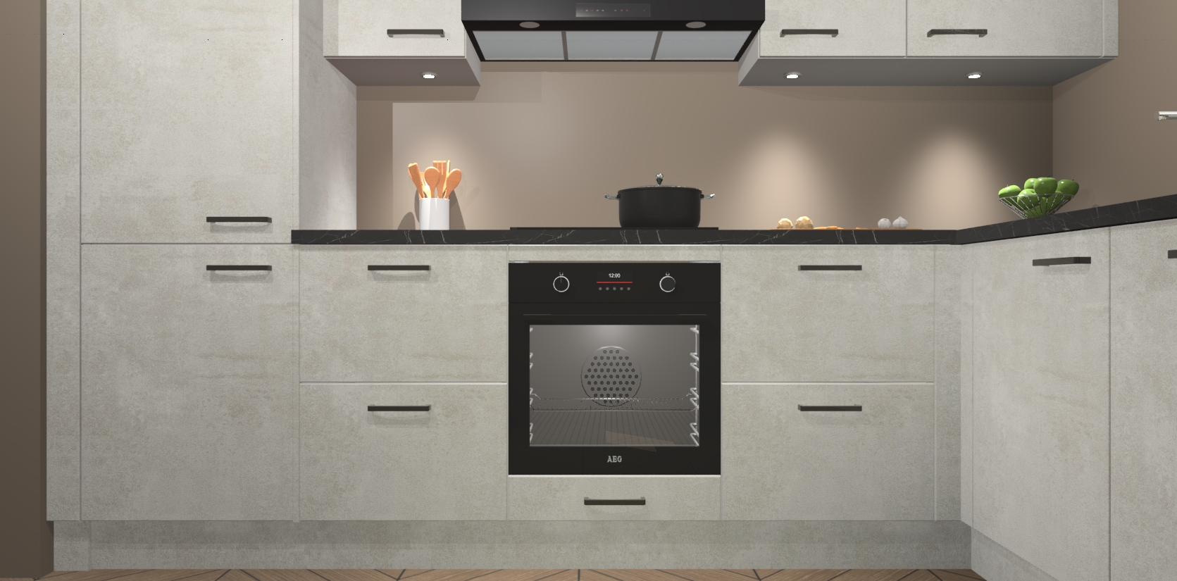 De Beton Opaal keuken Geneve is uitgerust met 5 inbouwapparaten - een oven, inductiekookplaat, afzuigkap, vaatwasser en koelkast - voor al uw kook- en bewaarbehoeftes. U kunt deze apparaten desgewenst eenvoudig upgraden naar AEG of de oven omruilen voor een combimagnetron na het plaatsen van uw bestelling. En met de soft close deuren, voldoende opbergruimte en kasten die voorgemonteerd worden geleverd, bent u in een mum van tijd klaar om heerlijke maaltijden te bereiden!