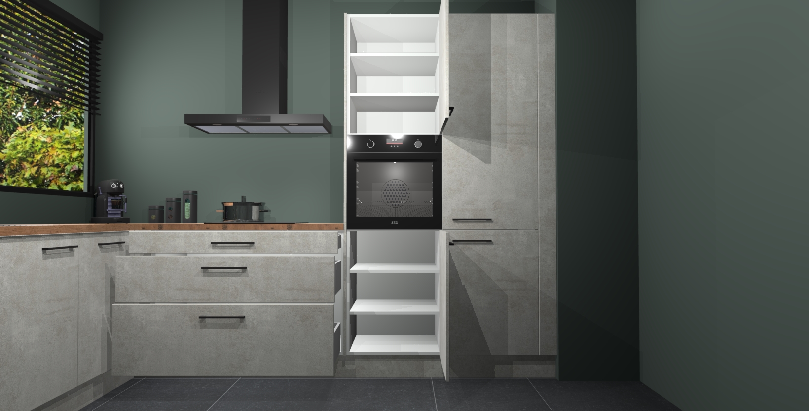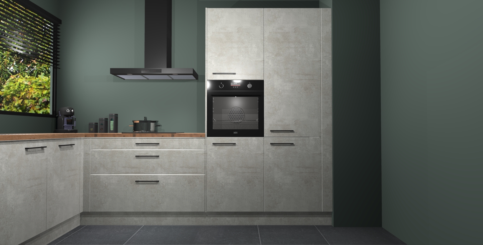 Met een modern, tijdloos design en ruime opslagruimte, zult u zich in no-time thuis voelen in uw nieuwe keuken. Uw leven wordt eenvoudiger met de soft-close deuren die voor het ultieme stille comfort zorgen - geen geluid dat u stoort terwijl u kookt. Ook is de keuken voorzien van 5 ingebouwde apparaten: een oven, inductie kookplaat, afzuigkap, vaatwasser en koelkast. Deze kunnen gemakkelijk na bestelling worden bijgewerkt naar AEG - waardoor uw luxe ervaring compleet is.