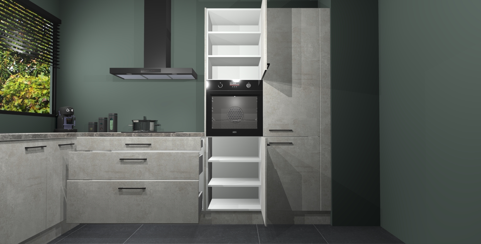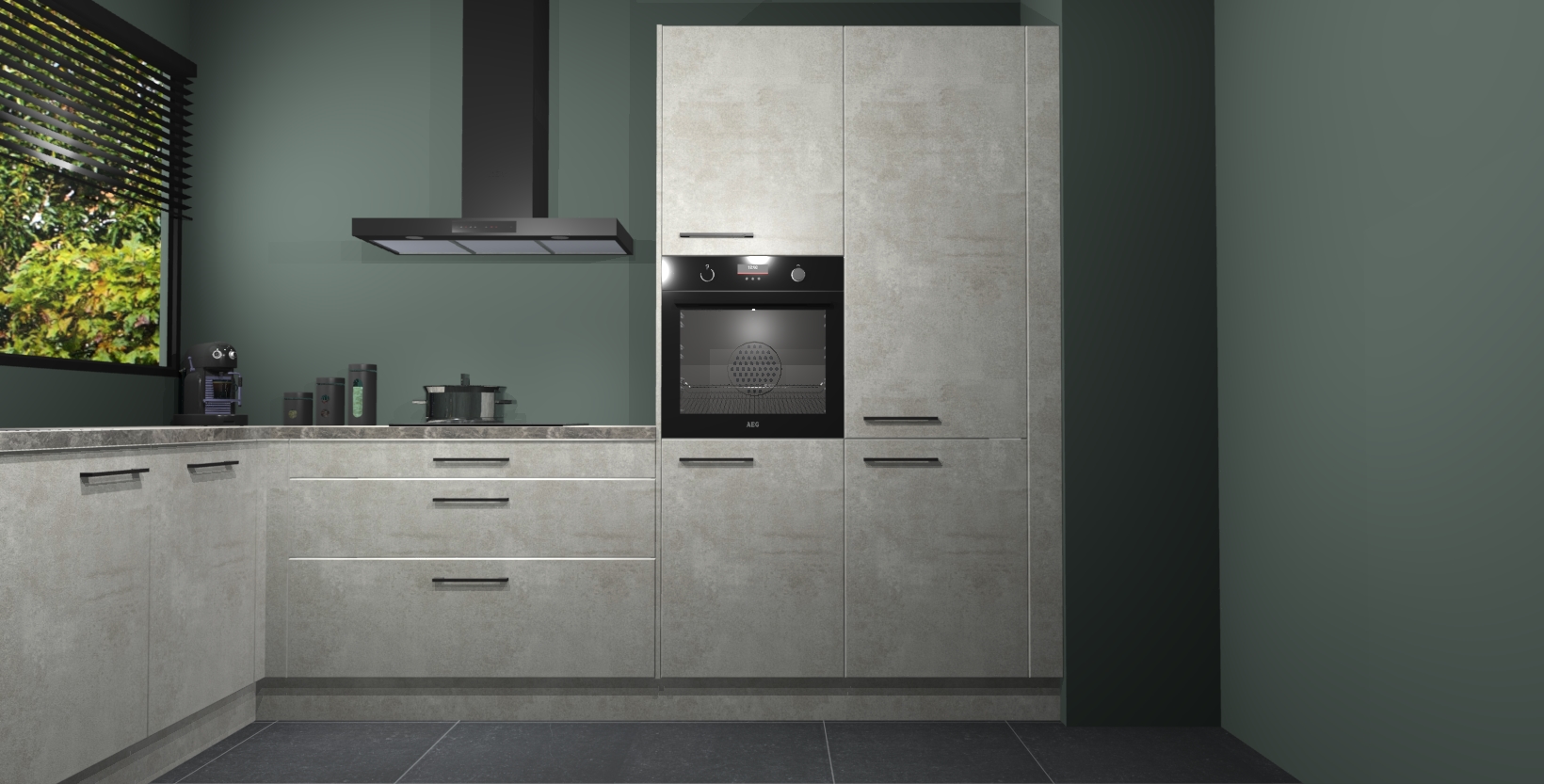 Met een modern, tijdloos design en ruime opslagruimte, zult u zich in no-time thuis voelen in uw nieuwe keuken. Uw leven wordt eenvoudiger met de soft-close deuren die voor het ultieme stille comfort zorgen - geen geluid dat u stoort terwijl u kookt. Ook is de keuken voorzien van 5 ingebouwde apparaten: een oven, inductie kookplaat, afzuigkap, vaatwasser en koelkast. Deze kunnen gemakkelijk na bestelling worden bijgewerkt naar AEG - waardoor uw luxe ervaring compleet is.