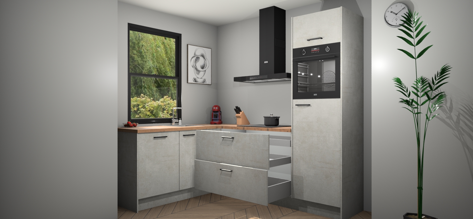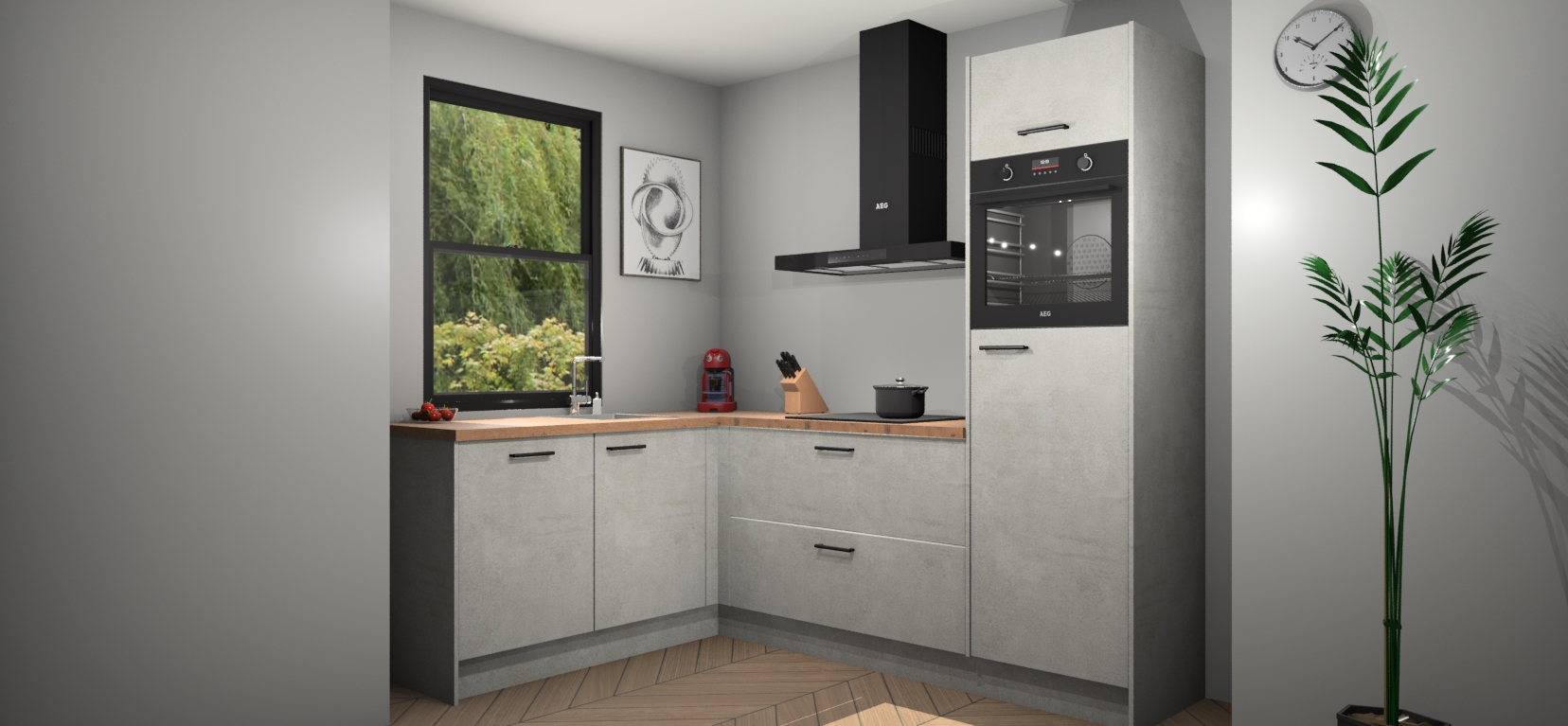 Deze prachtige hoekkeuken heeft alle benodigdheden om uw droomkook- en eetruimte compleet te maken. De Beton Opaal kasten bieden een echo van raffinement, terwijl de 5 inbouwapparaten genoeg opties bieden voor het bereiden van heerlijke maaltijden. De oven, inductiekookplaat, afzuigkap, vaatwasser en koelkast zorgen ervoor dat u tijd in de keuken zo efficiënt mogelijk verloopt, terwijl ze ook dat extra vleugje luxe bieden.
