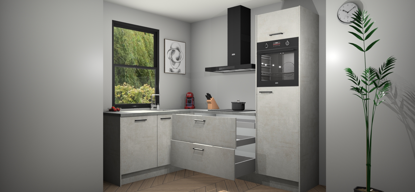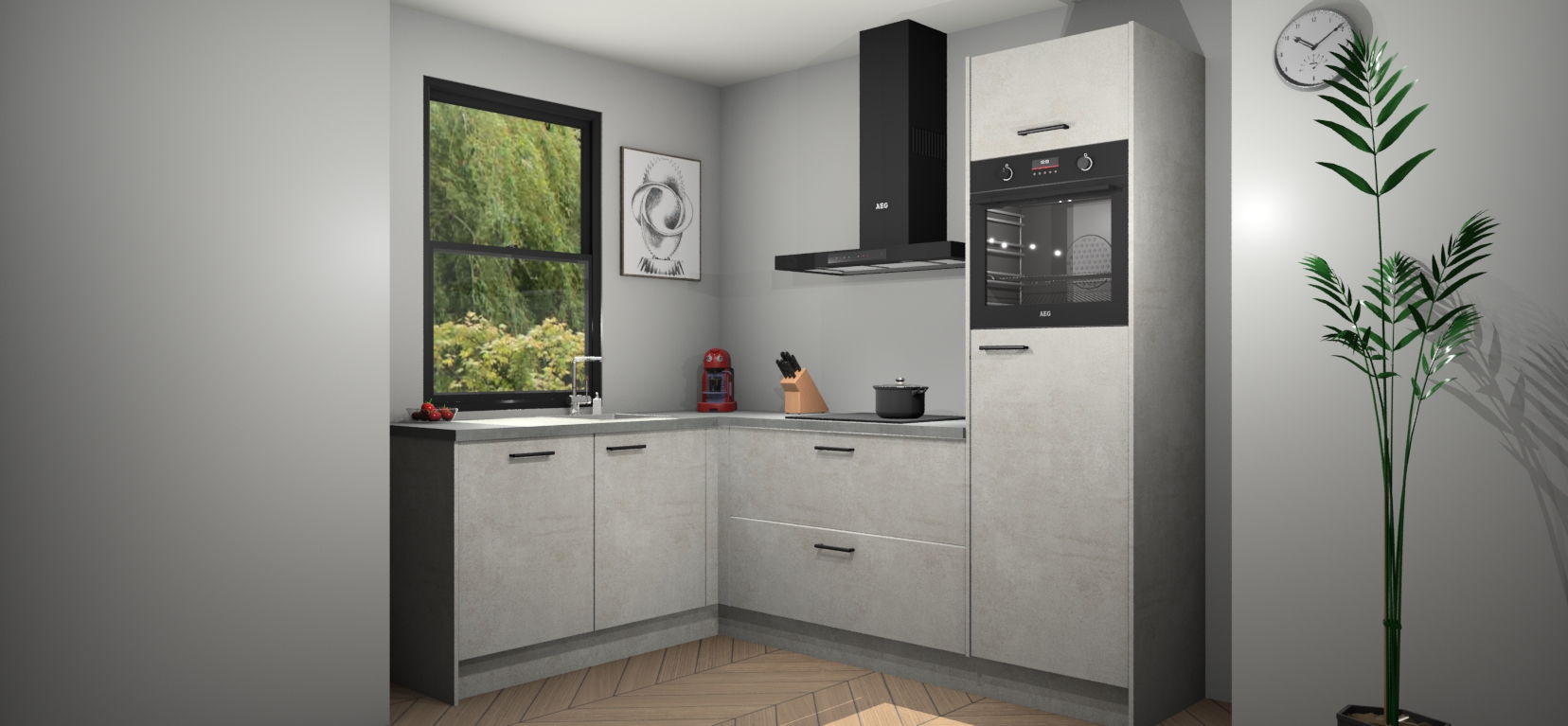 Deze prachtige hoekkeuken heeft alle benodigdheden om uw droomkook- en eetruimte compleet te maken. De Beton Opaal kasten bieden een echo van raffinement, terwijl de 5 inbouwapparaten genoeg opties bieden voor het bereiden van heerlijke maaltijden. De oven, inductiekookplaat, afzuigkap, vaatwasser en koelkast zorgen ervoor dat u tijd in de keuken zo efficiënt mogelijk verloopt, terwijl ze ook dat extra vleugje luxe bieden.