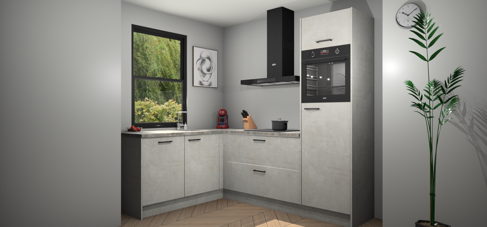 Deze prachtige hoekkeuken heeft alle benodigdheden om uw droomkook- en eetruimte compleet te maken. De Beton Opaal kasten bieden een echo van raffinement, terwijl de 5 inbouwapparaten genoeg opties bieden voor het bereiden van heerlijke maaltijden. De oven, inductiekookplaat, afzuigkap, vaatwasser en koelkast zorgen ervoor dat u tijd in de keuken zo efficiënt mogelijk verloopt, terwijl ze ook dat extra vleugje luxe bieden.
