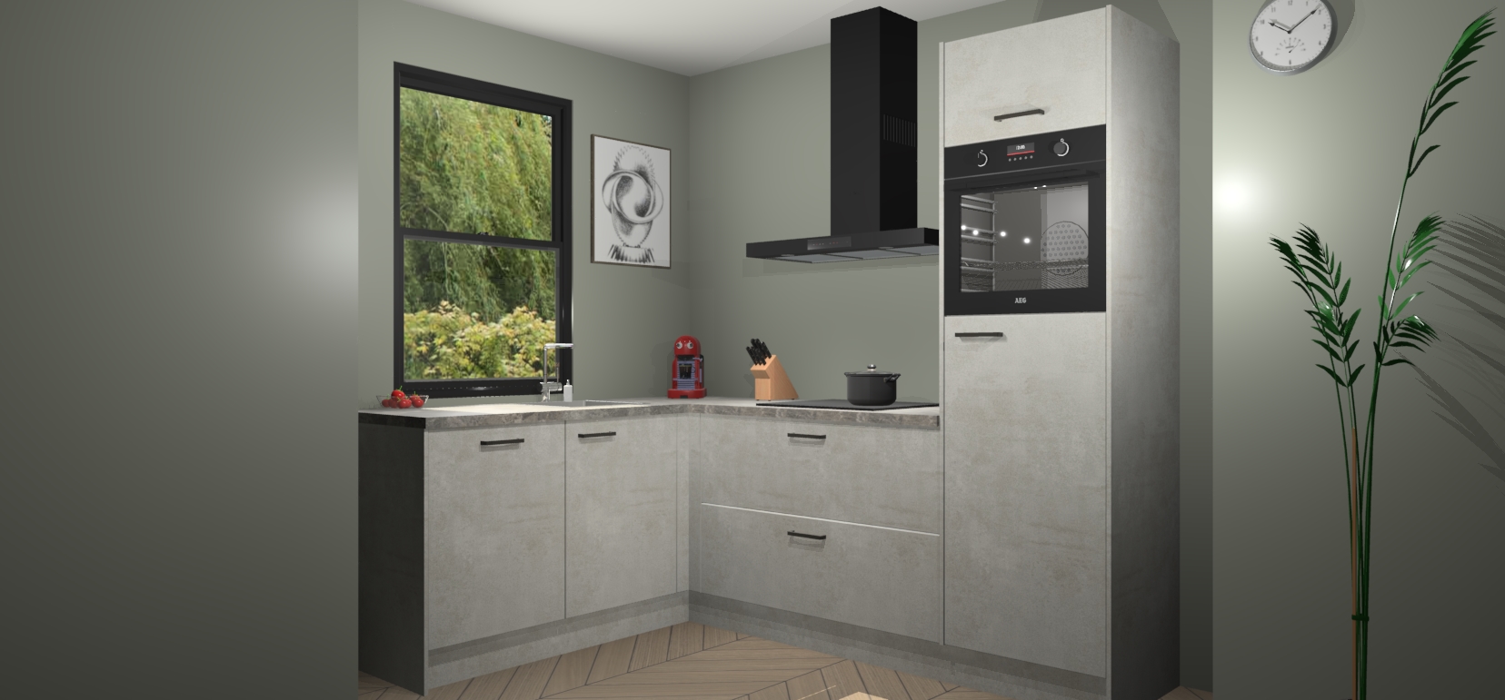 Deze prachtige hoekkeuken heeft alle benodigdheden om uw droomkook- en eetruimte compleet te maken. De Beton Opaal kasten bieden een echo van raffinement, terwijl de 5 inbouwapparaten genoeg opties bieden voor het bereiden van heerlijke maaltijden. De oven, inductiekookplaat, afzuigkap, vaatwasser en koelkast zorgen ervoor dat u tijd in de keuken zo efficiënt mogelijk verloopt, terwijl ze ook dat extra vleugje luxe bieden.