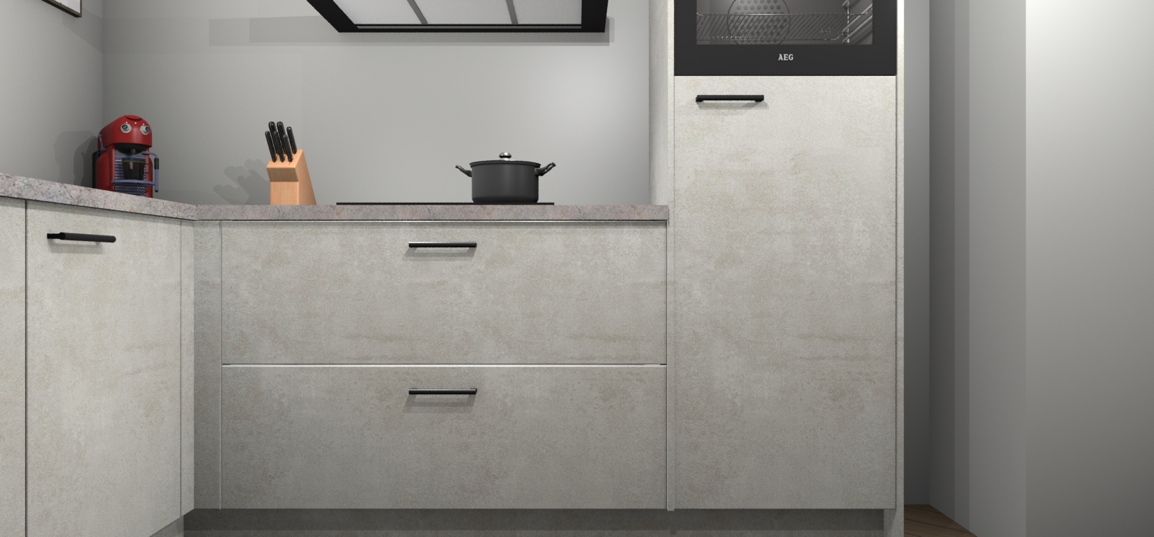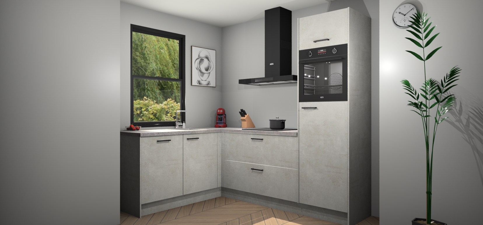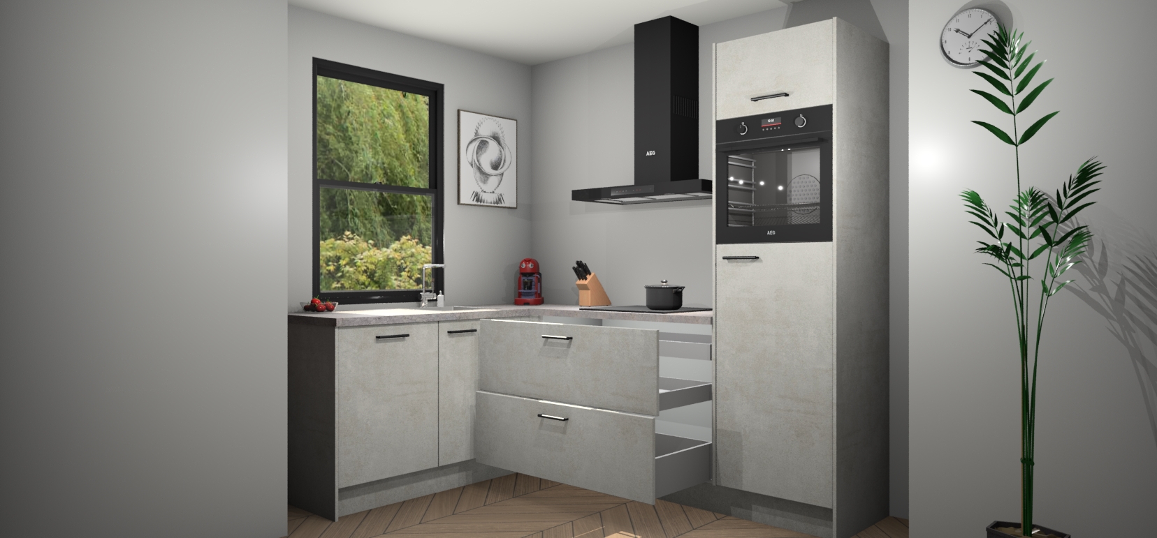 Deze prachtige hoekkeuken heeft alle benodigdheden om uw droomkook- en eetruimte compleet te maken. De Beton Opaal kasten bieden een echo van raffinement, terwijl de 5 inbouwapparaten genoeg opties bieden voor het bereiden van heerlijke maaltijden. De oven, inductiekookplaat, afzuigkap, vaatwasser en koelkast zorgen ervoor dat u tijd in de keuken zo efficiënt mogelijk verloopt, terwijl ze ook dat extra vleugje luxe bieden.